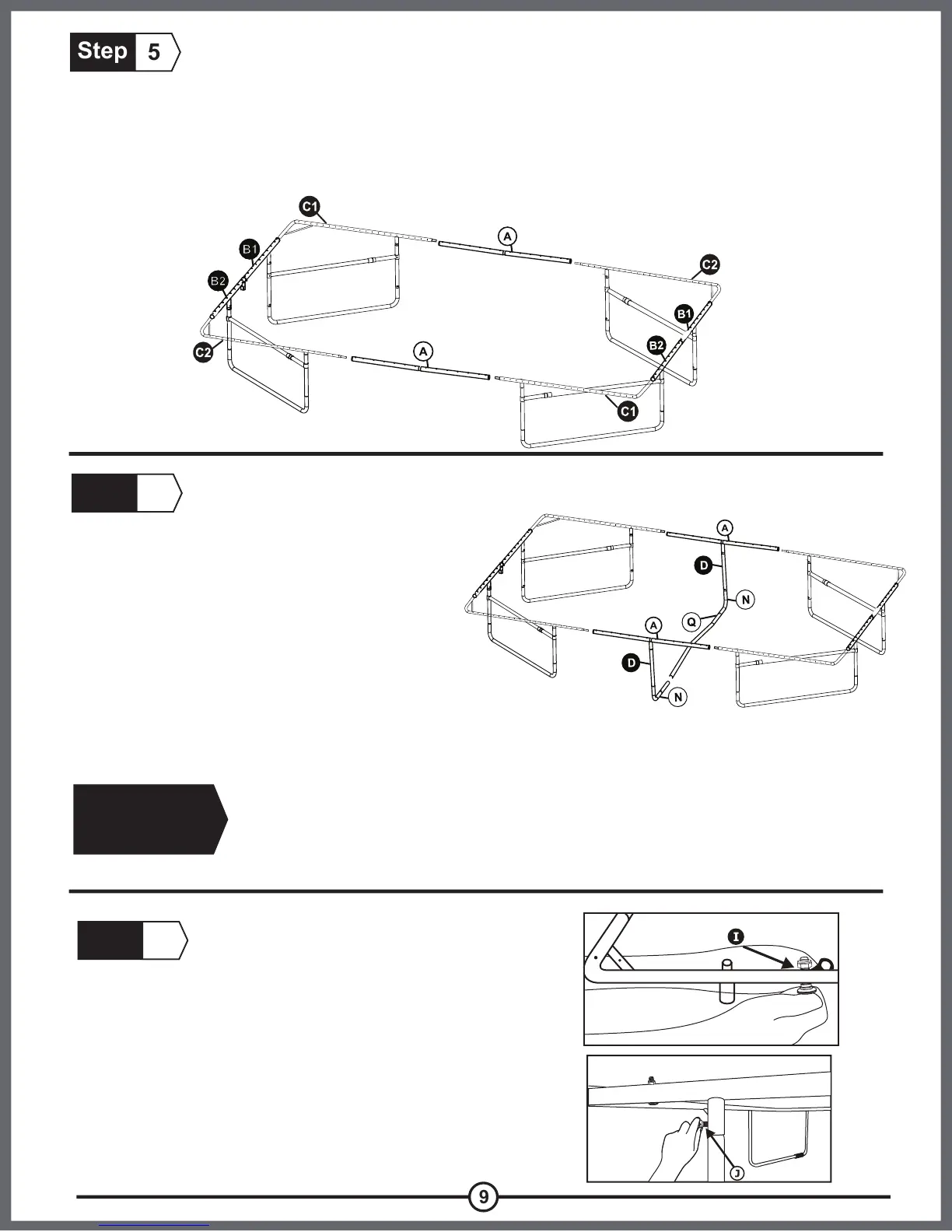 Connect the top rails B1 and B2. Attach part A- the long side of the trampoline, to the