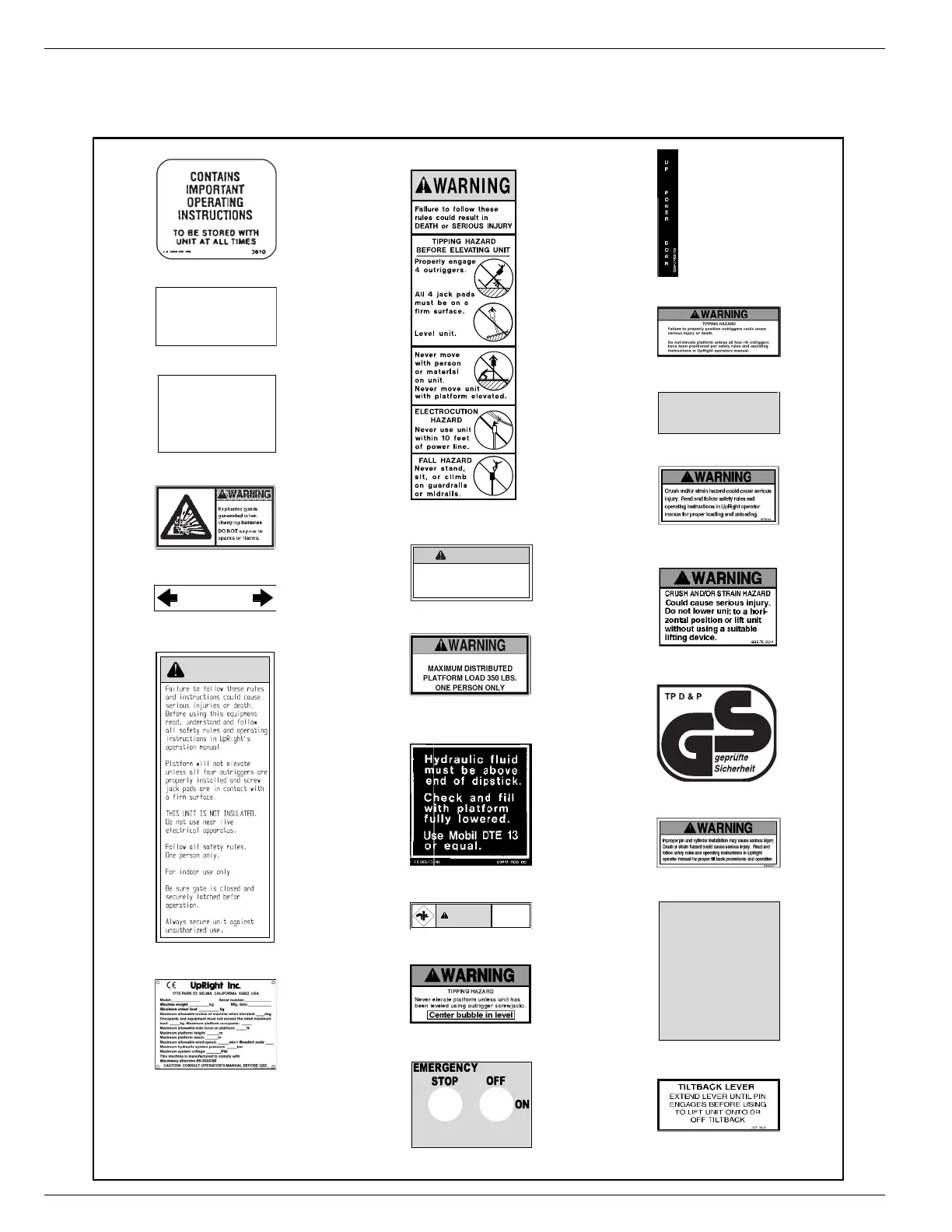 These labels shall be present and in good condition before operating the work platform. Be sure to read,