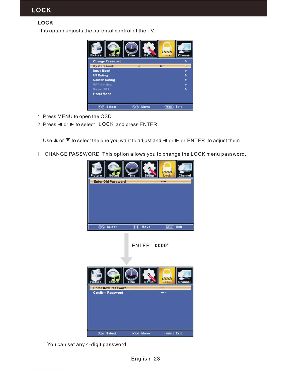 Upstar P32EE7 - Lock Settings and Parental Controls; Password Management; System Lock and Input Blocking