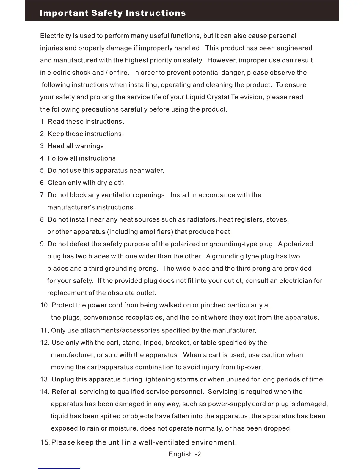Upstar P32EE7 - Important Safety Instructions