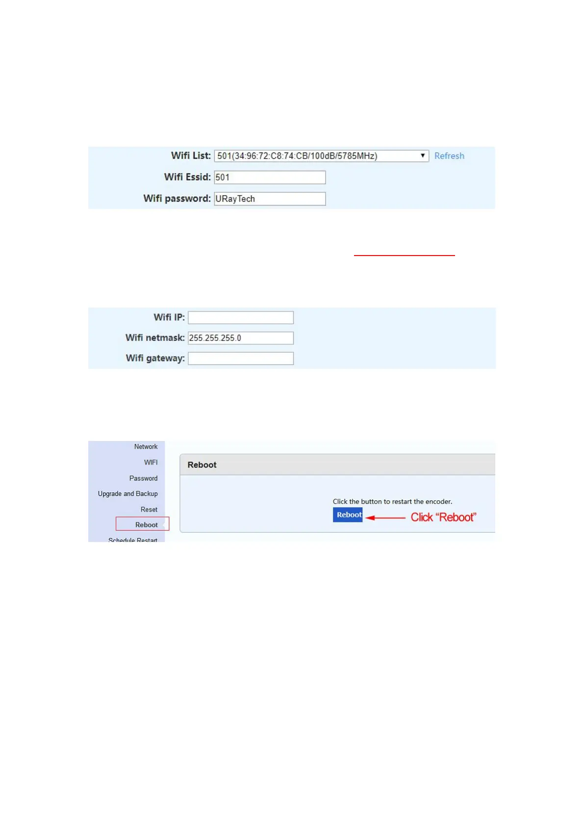 Step 5. Enter the name and password of the WIFI in ‘‘WIFI Essid’’ and ‘‘WIFI Password’’.