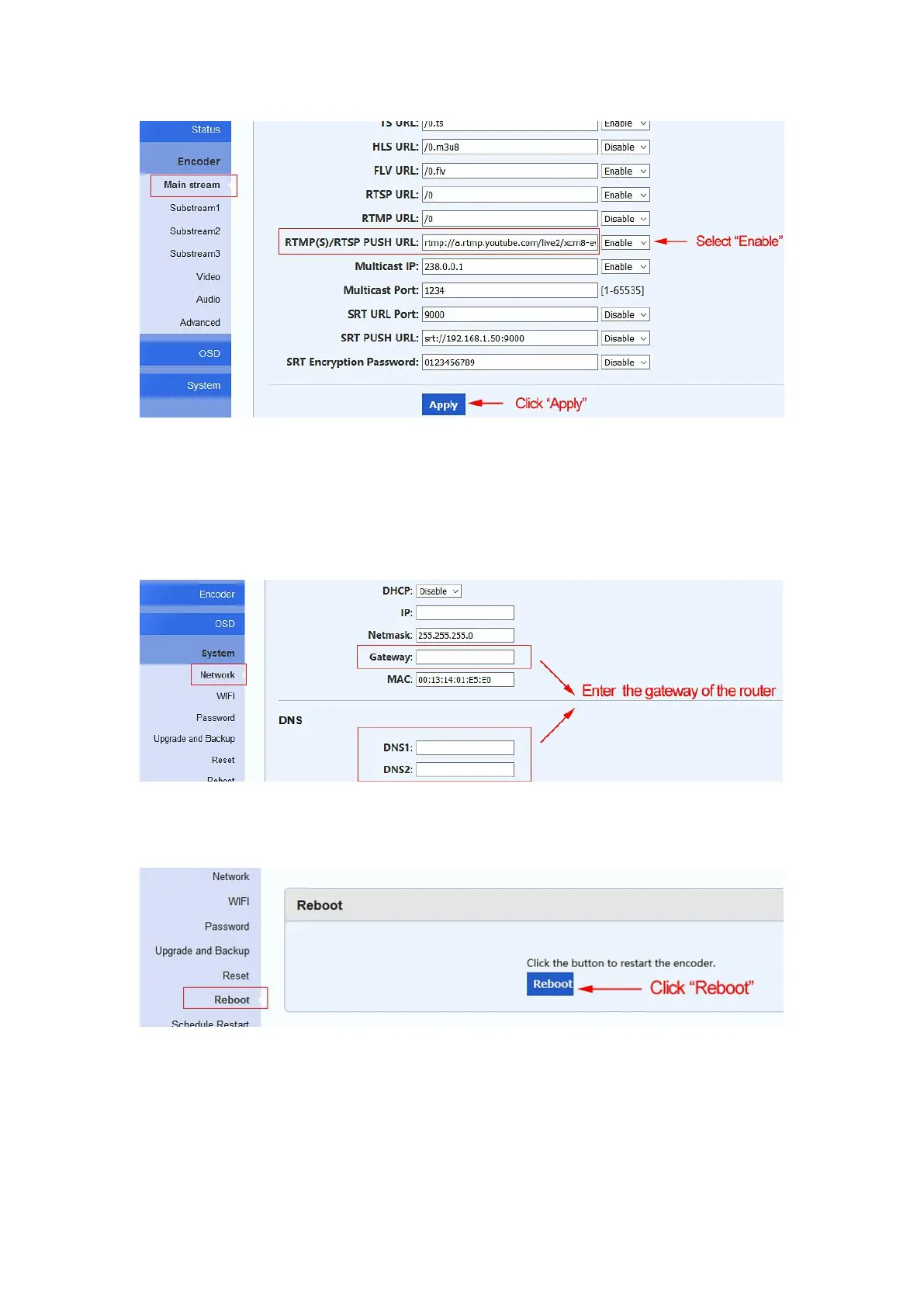 Enter the gateway of the router to the setting of the ’’DNS1’’ and ‘‘DNS2’’ and ‘‘Gateway’’.