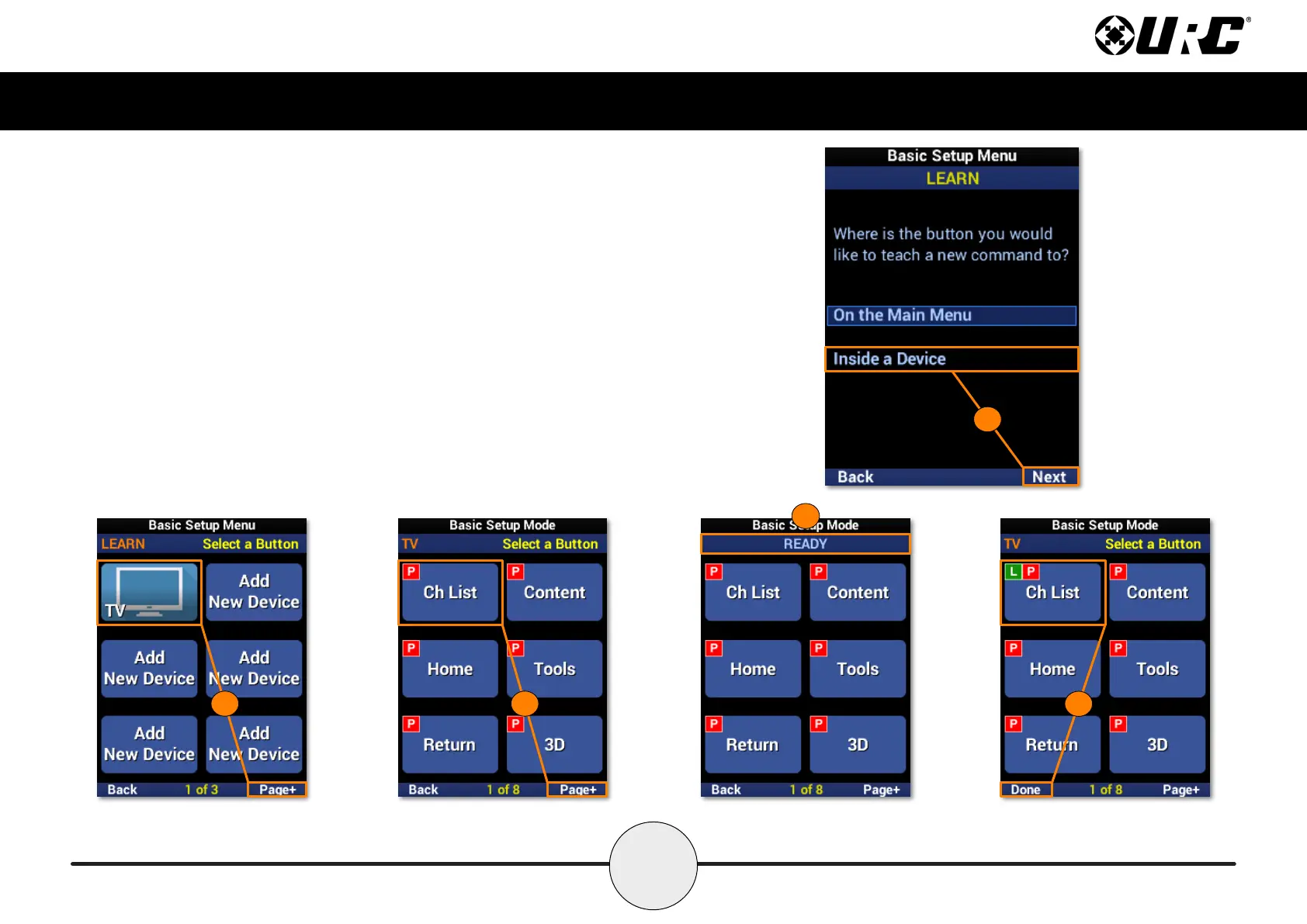3. Select the function button to learn an IR command to. Use Page+ to move between pages.