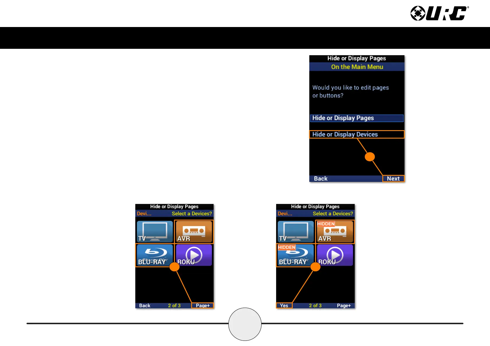 2. Select each device to be hidden. Use Page+ to move between device pages.