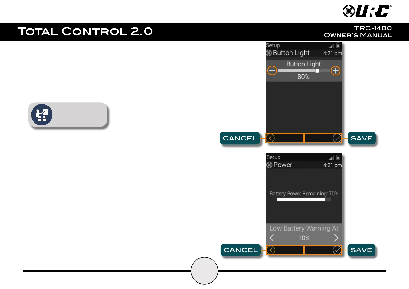 Adjust the brightness of the remote’s button backlighting. Press the adjacent LCD