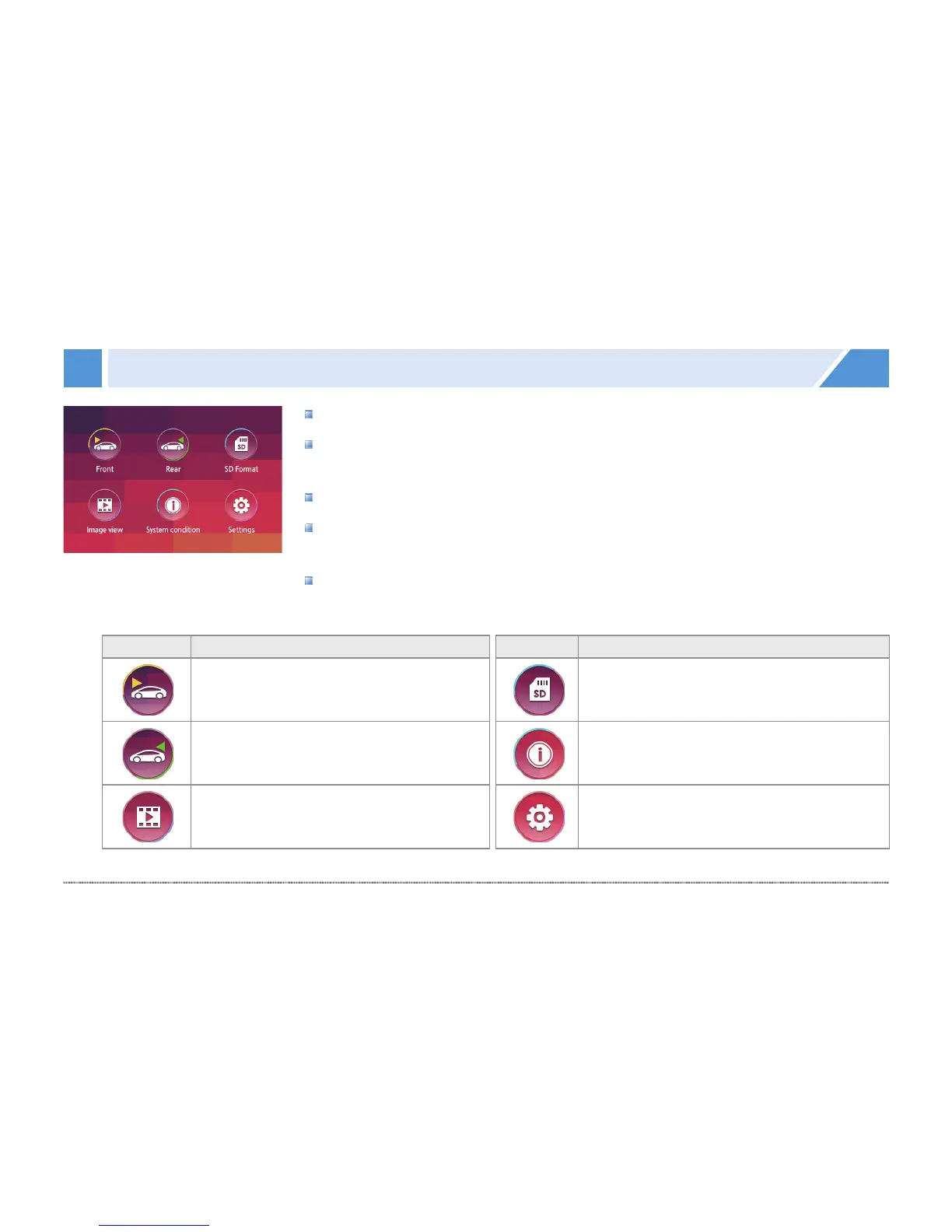 The menu screen has 6 icons: Front view, Rear view, SD Format, Image view,