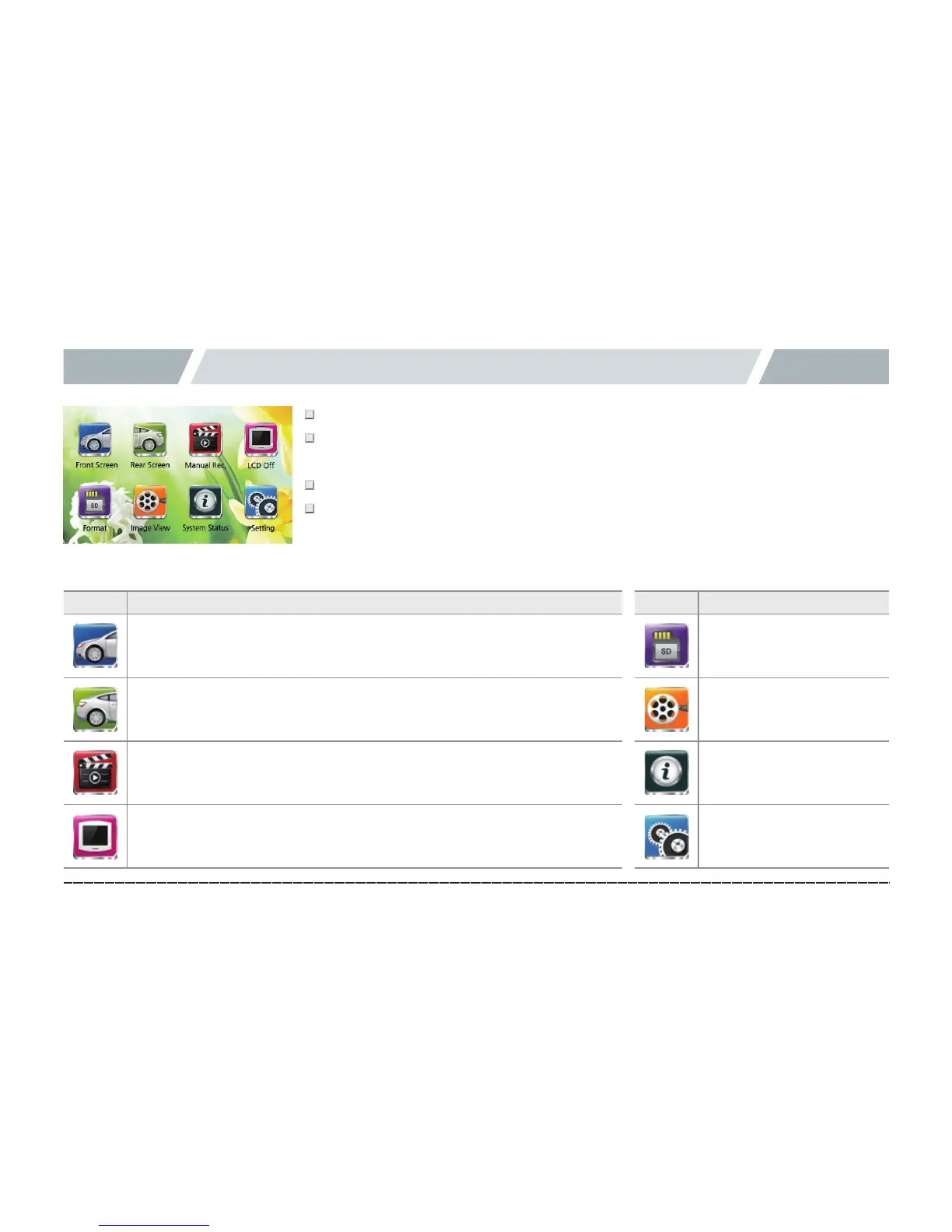 The menu screen has 6 icons: Front view, Rear view, Format SD, Video list, System