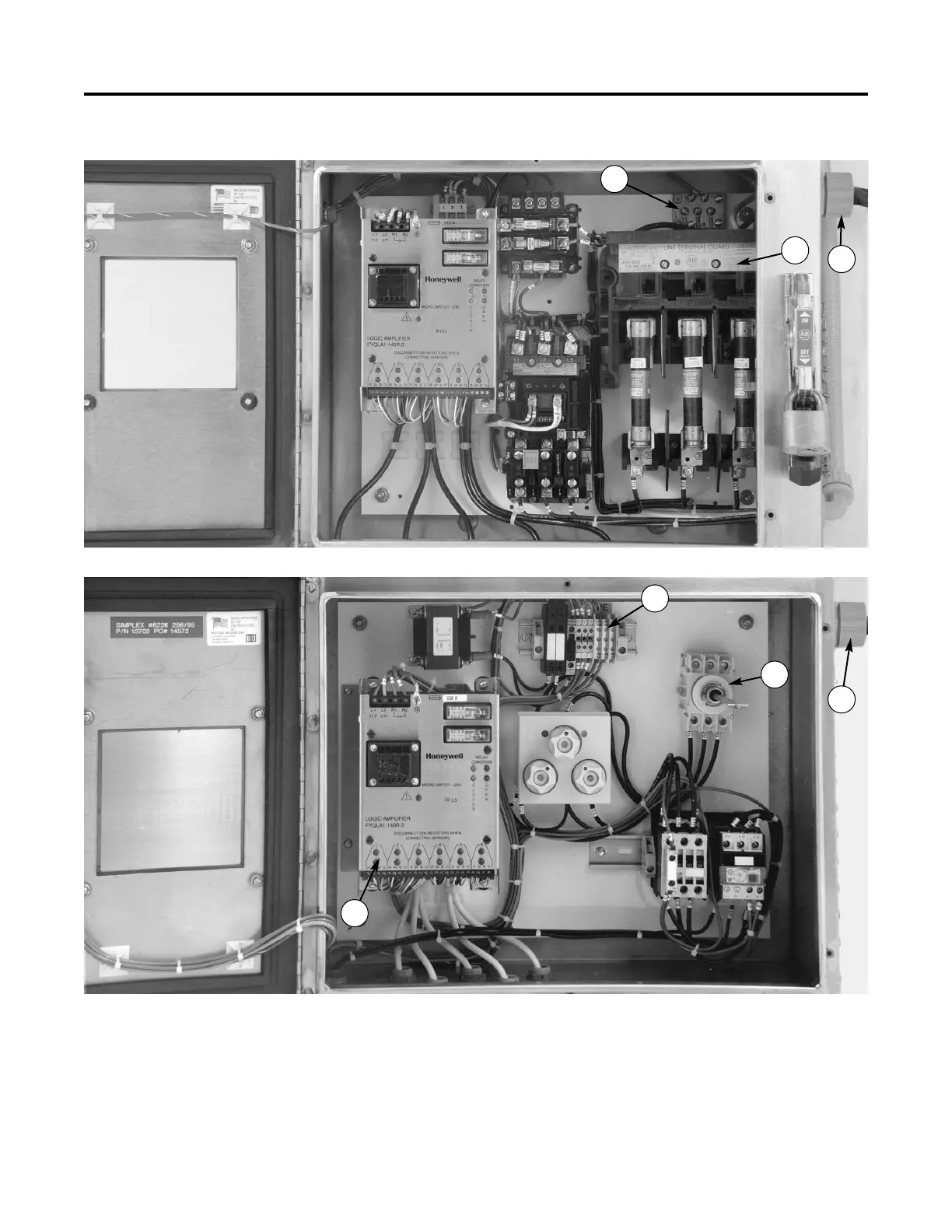 Figure 17 — Interior of starter enclosure (NEMA* configuration, top, and IEC** configuration, bottom). (1) Discon-