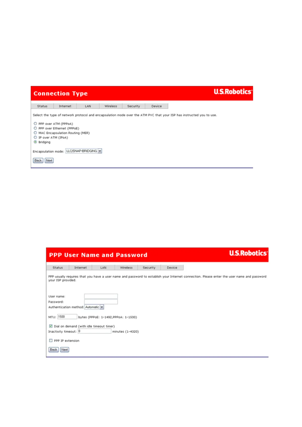 The Connection Type page allows you to select the type of network protocol over the ATM