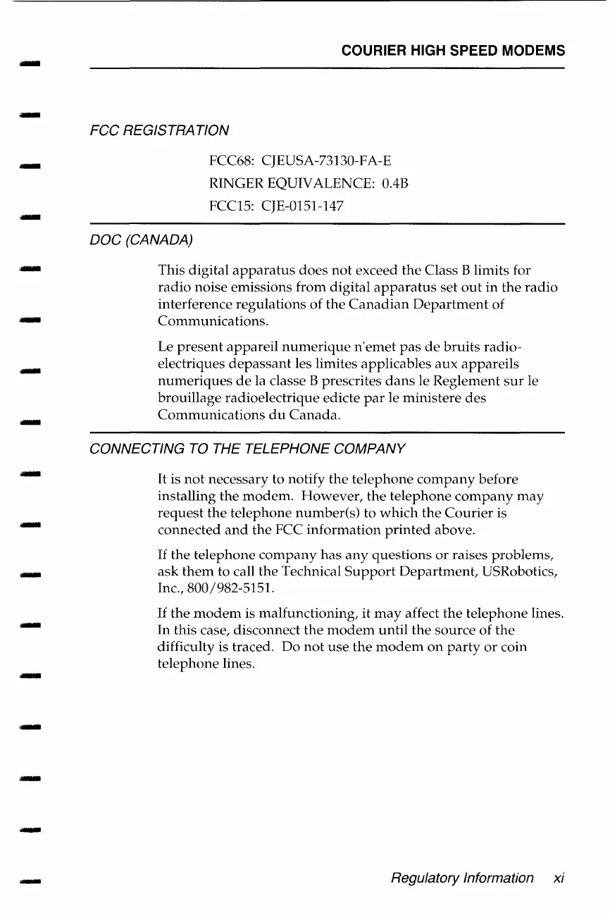 US Robotics COURIER - FCC Registration Information; Canadian DOC Compliance; Telephone Company Connection Guidelines