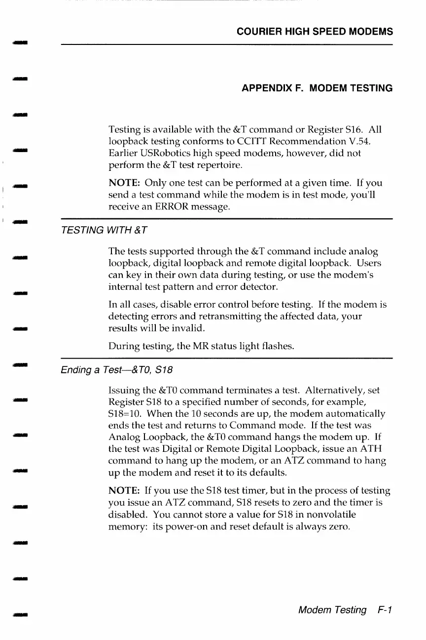 US Robotics COURIER - APPENDIX F. MODEM TESTING; Modem Testing with &T Commands