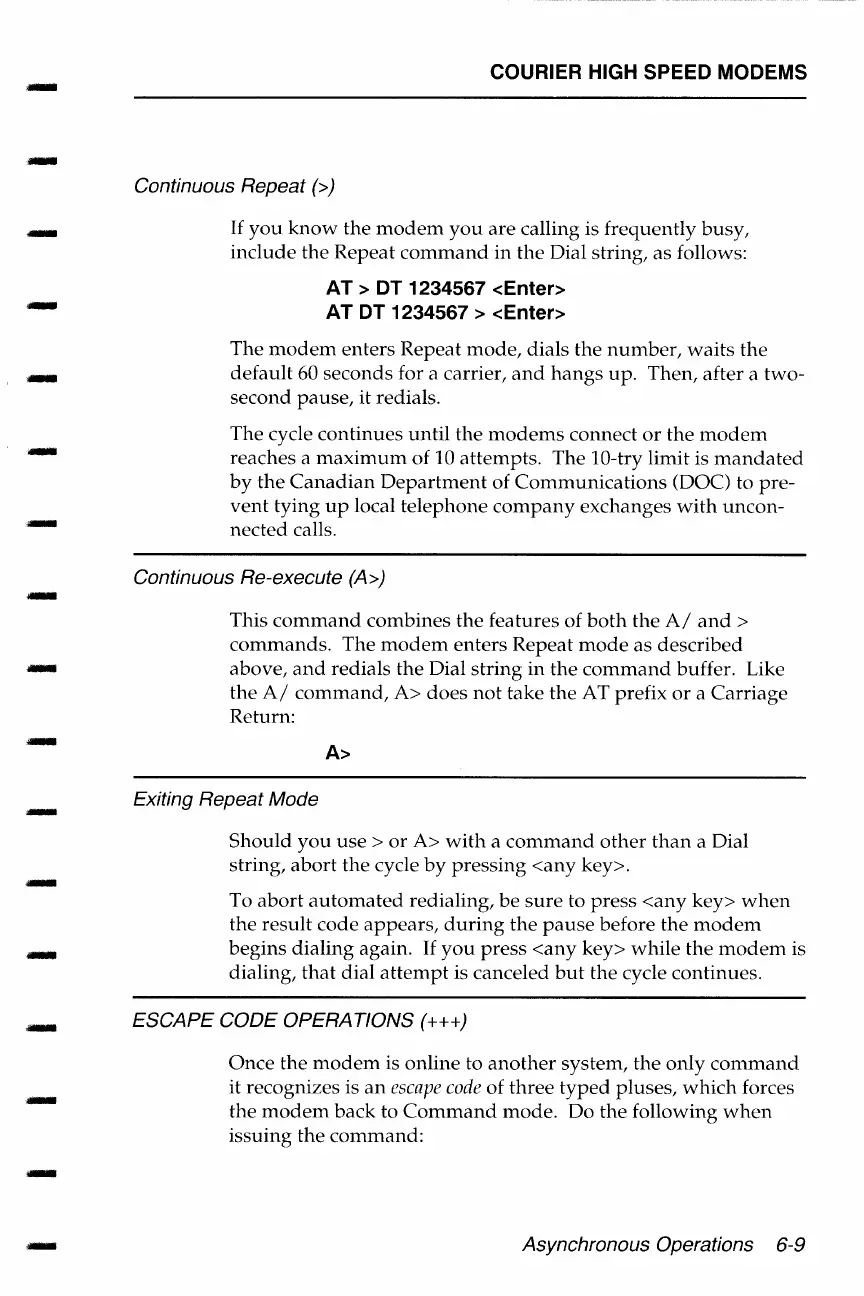 US Robotics COURIER - Continuous Re-Execute (A>); Continuous Repeat(>); Exiting Repeat Mode; Escape Code Operations(+++)