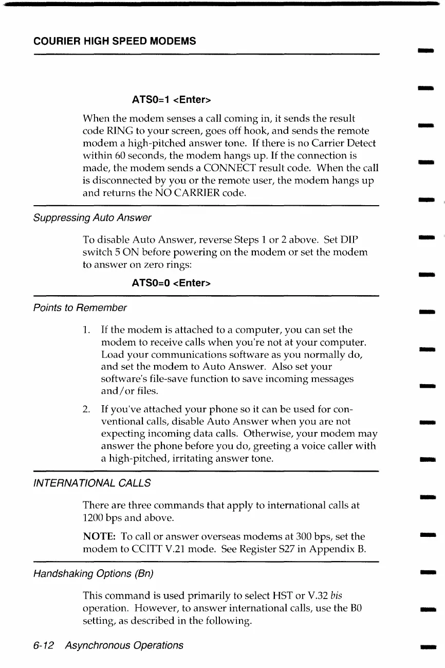 US Robotics COURIER - Suppressing Auto Answer; Points to Remember; International Calls; Handshaking Options (Bn)