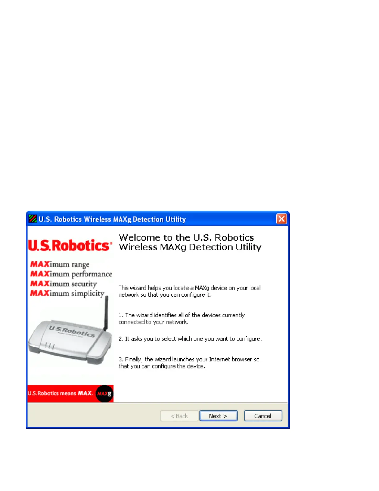 Installation CD-ROM to install and run the USRobotics Wireless MAXg Detection Utility and configure basic