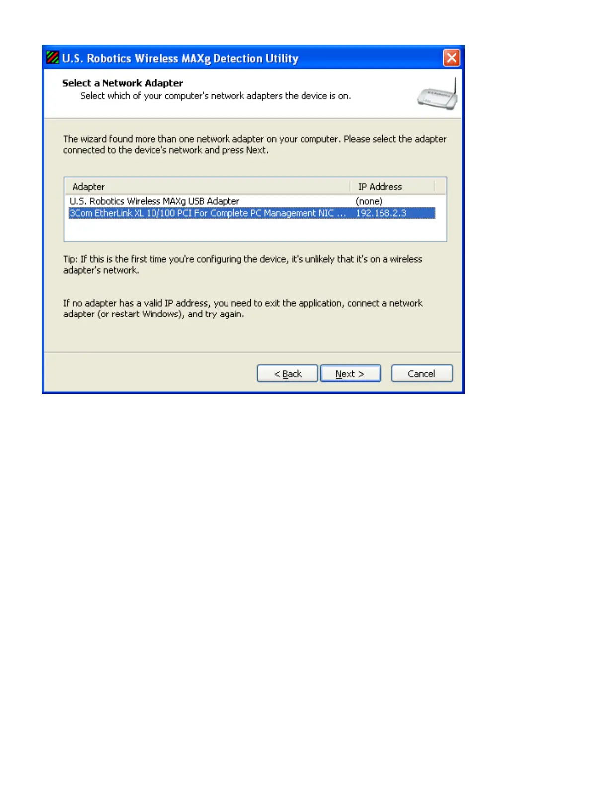 The detection utility lists the access point as well as any other USRobotics devices that were found: