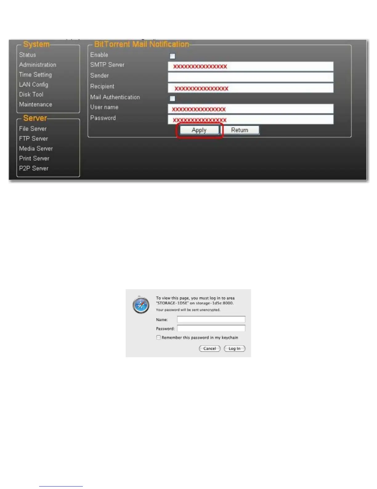 Beispiel: Geben Sie http://storage-1d5e (Hostname) oder http://192.168.1.121 (IP-Adresse) ein.