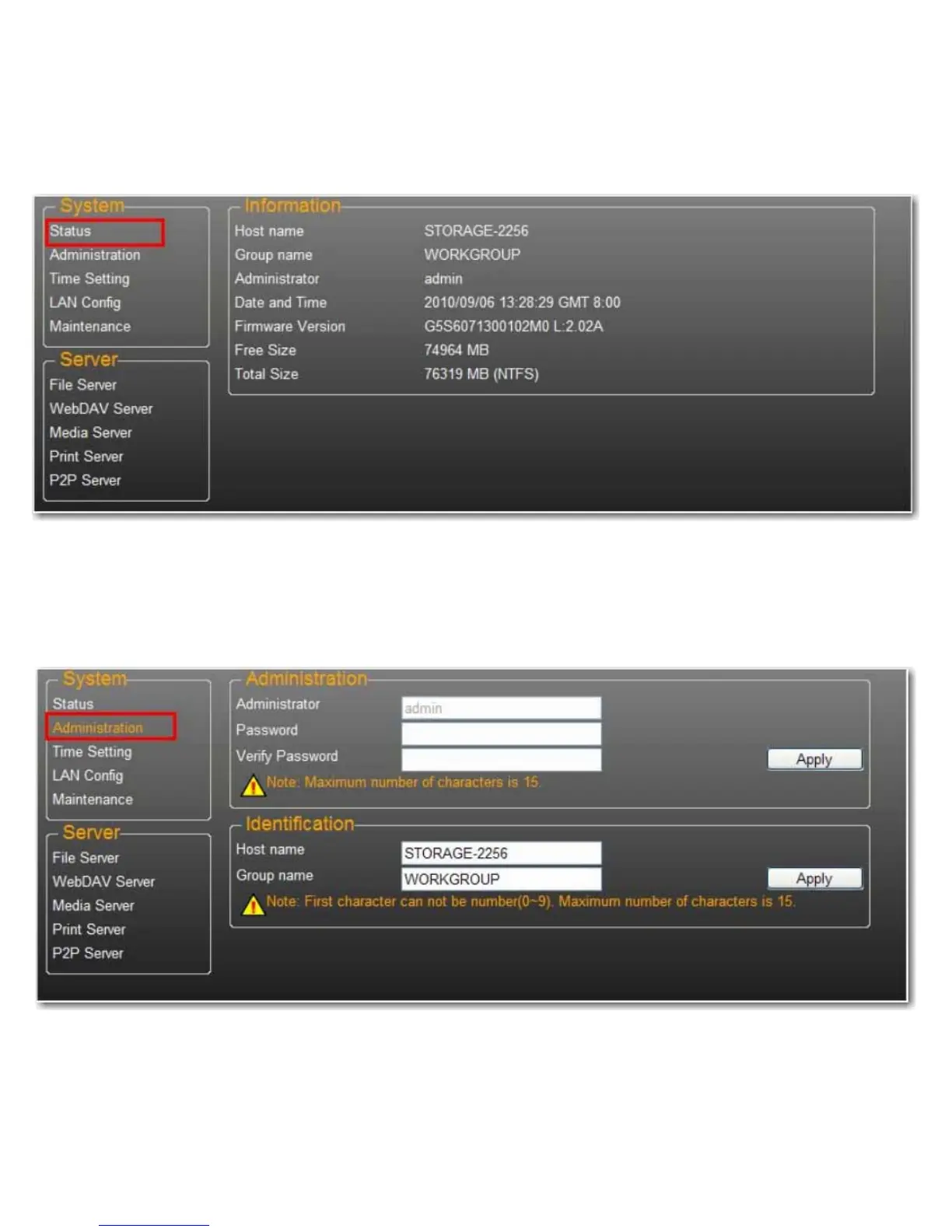 En esta página puede cambiar y modificar el nombre de host, el nombre de grupo y la contraseña. Haga clic en Apply