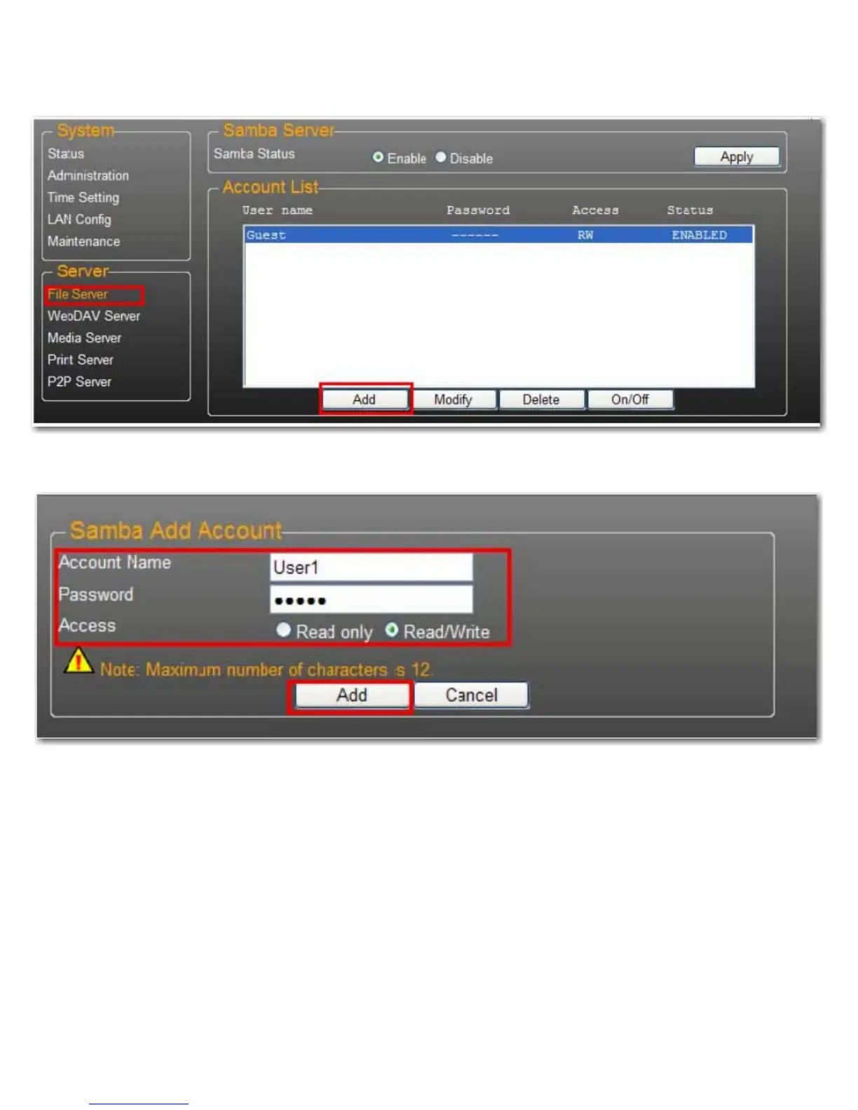 2. Introduzca un nuevo Account Name (Nombre de cuenta) y Password (Contraseña), establezca el nivel de Acceso