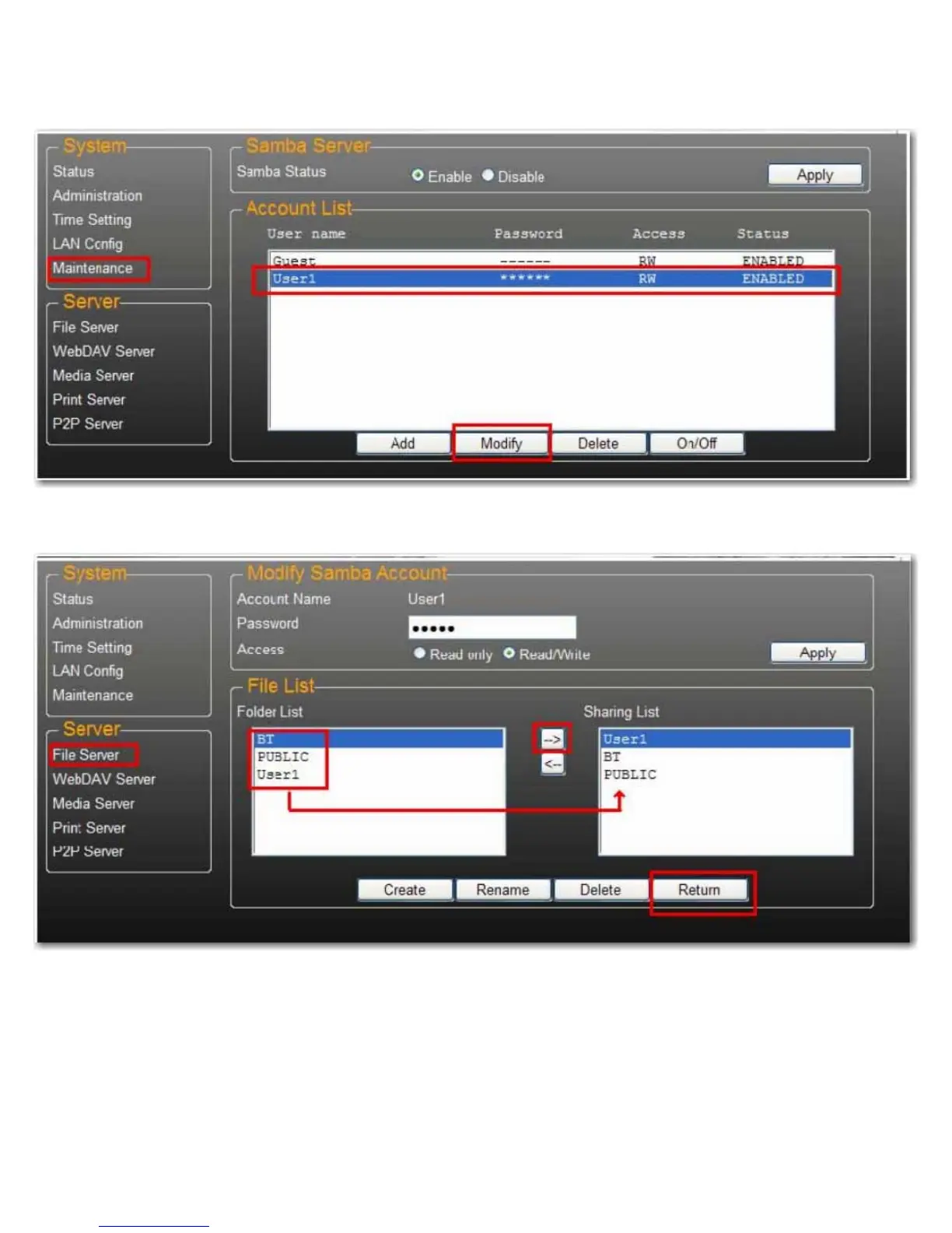 2. En esta página puede añadir una lista de recursos compartidos de carpeta para el usuario seleccionado o crear una