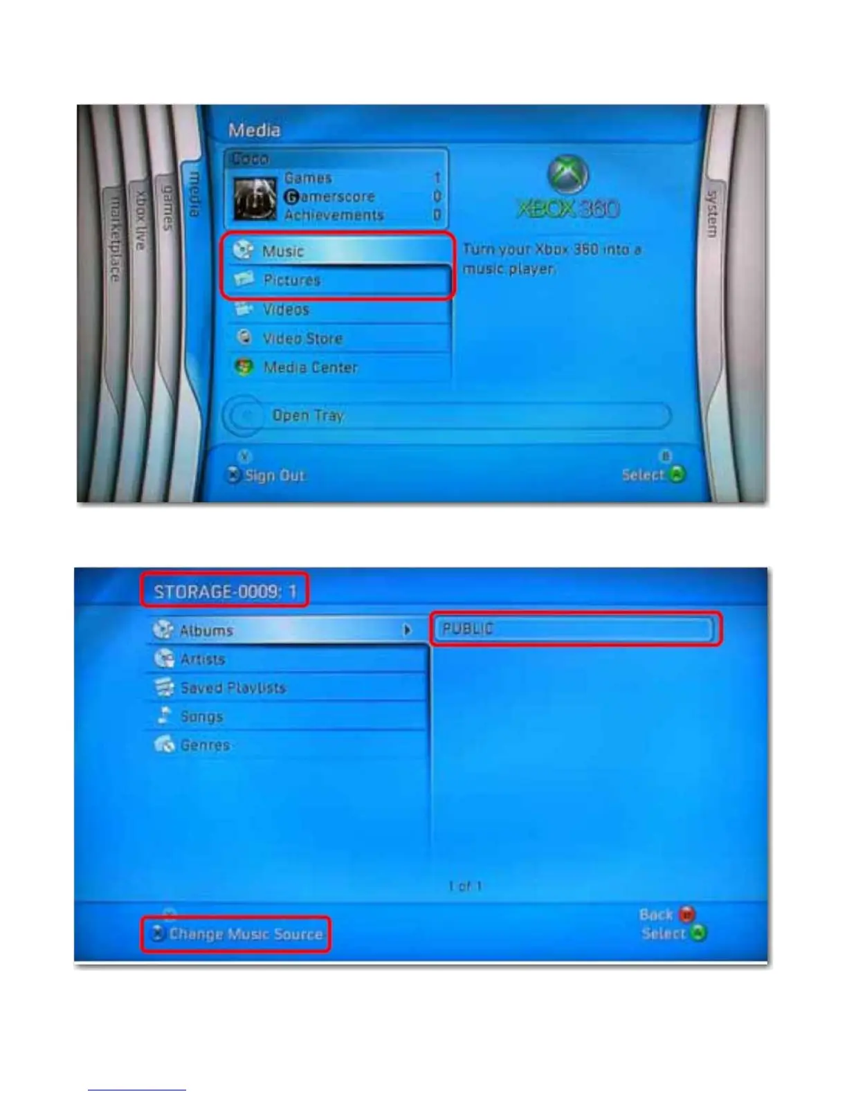 la Xbox 360, seleccione Música o Imágenes y pulse A para continuar en la Xbox 360.