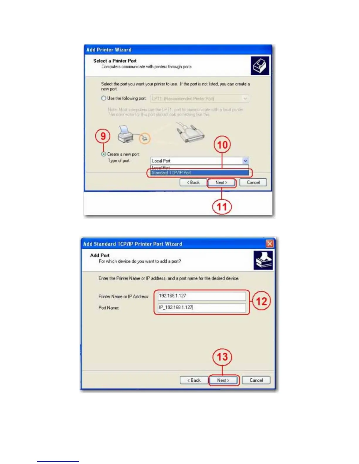 5. Seleccione Crear nuevo puerto Tipo de puerto:; a continuación, seleccione Puerto TCP/IP estándar y haga clic