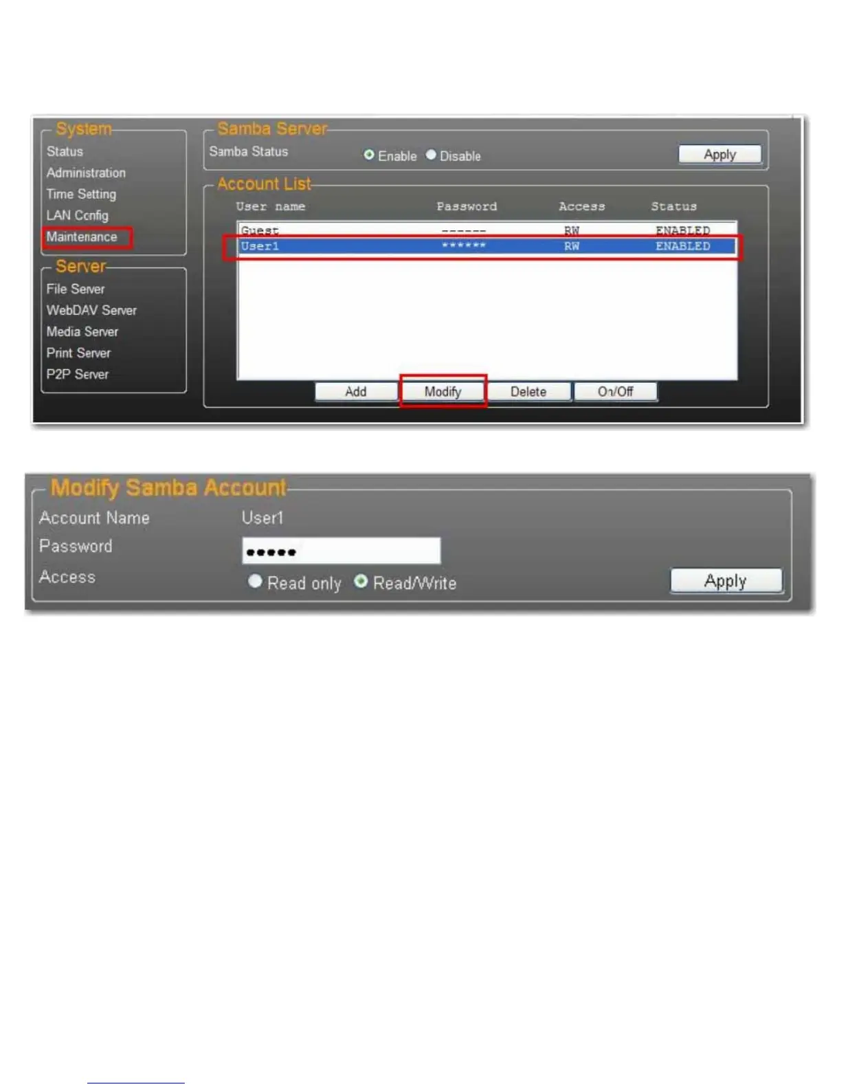US Robotics uShare USR8710 - SAMBA Password Management; Modifying User Account Passwords