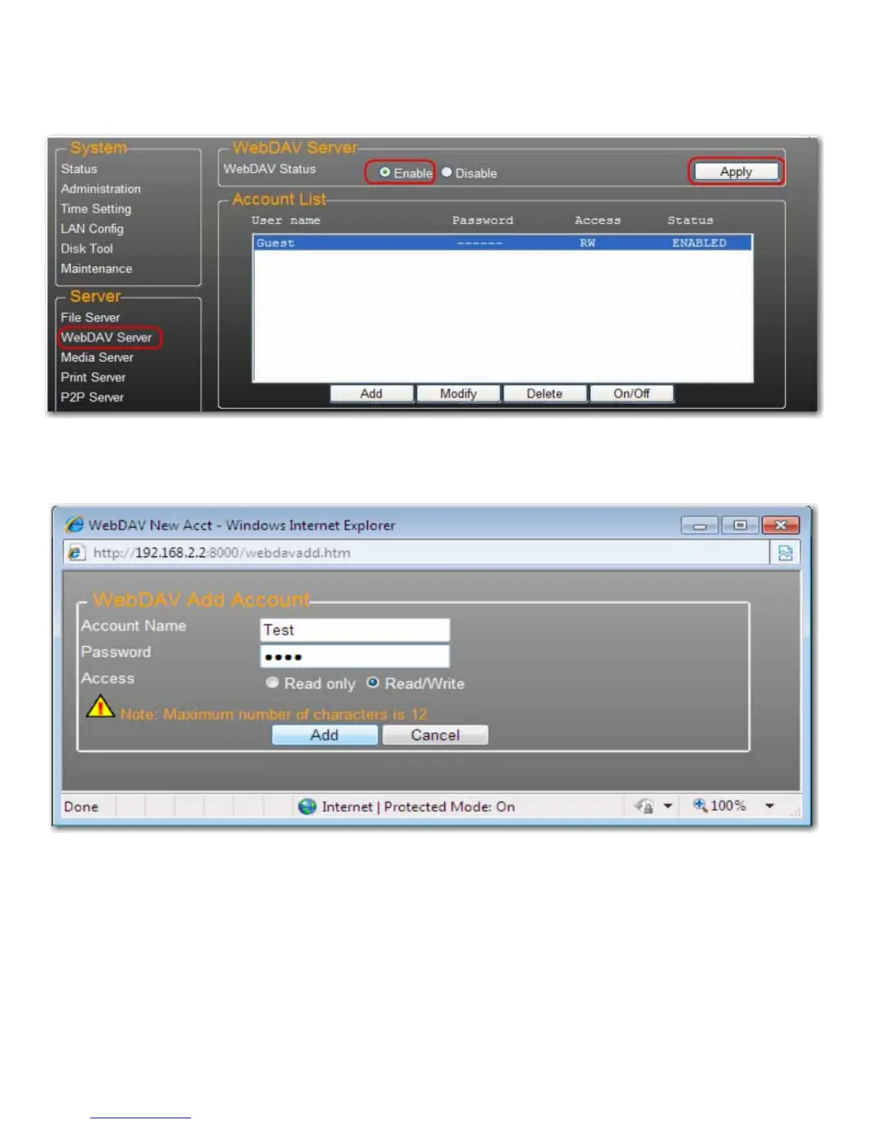 4. È ora necessario creare un account di condivisione WebDav. Fare clic sul pulsante Add (Aggiungi).