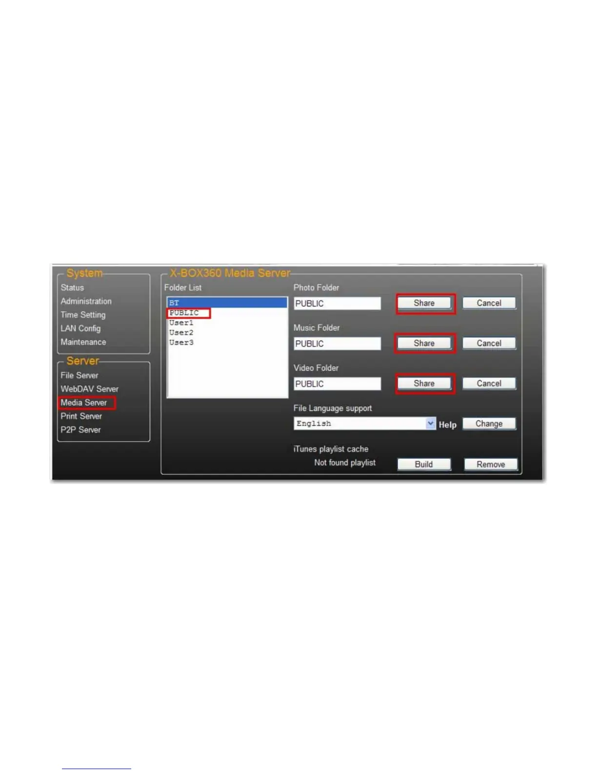 1. Go to the Media Server page and select the folder where you have the multimedia content and click Share.