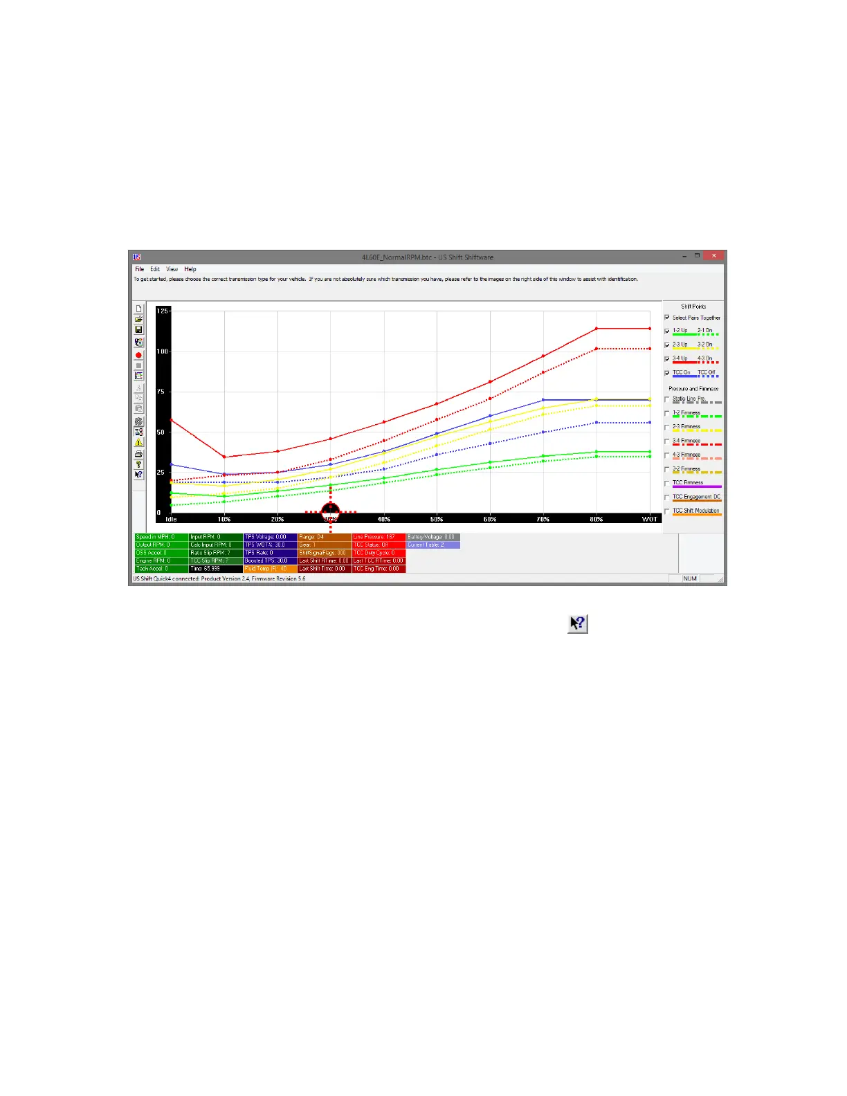 throttle position for each shift. It also displays the line pressure & firmness curve