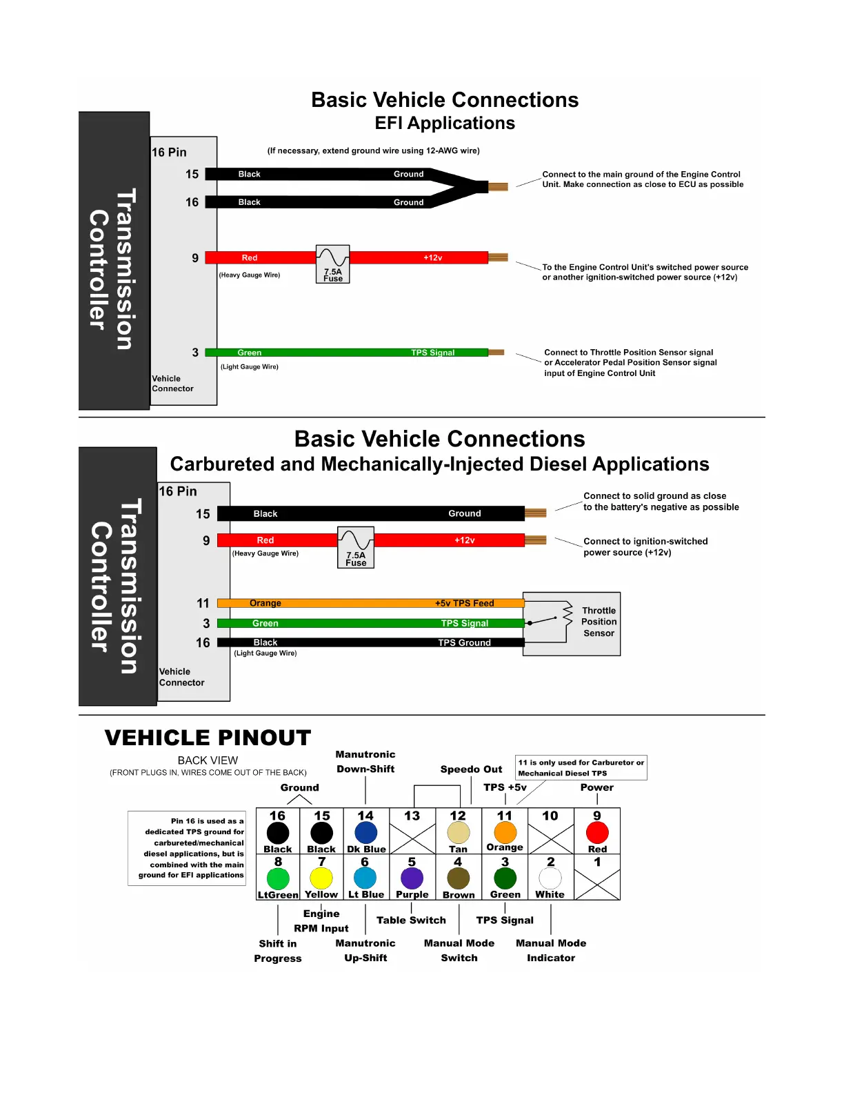 US Shift Quick 4 GEN2 - Basic Vehicle Connections Overview; EFI Application Wiring Overview; Diesel;Carbureted Wiring Overview; Vehicle Connector Pinout Diagram
