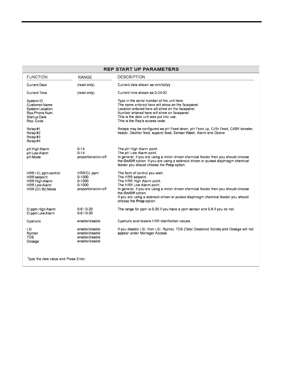 For each option you select from the Rep Start Up Menu the screen will display the previous value selected