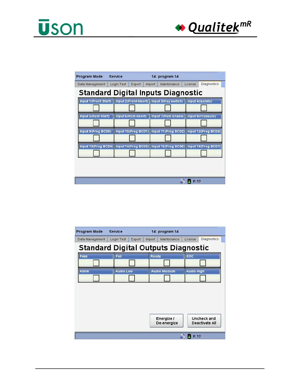 The Standard Digital Outputs screen is used to test these digital outputs: pass, fail,