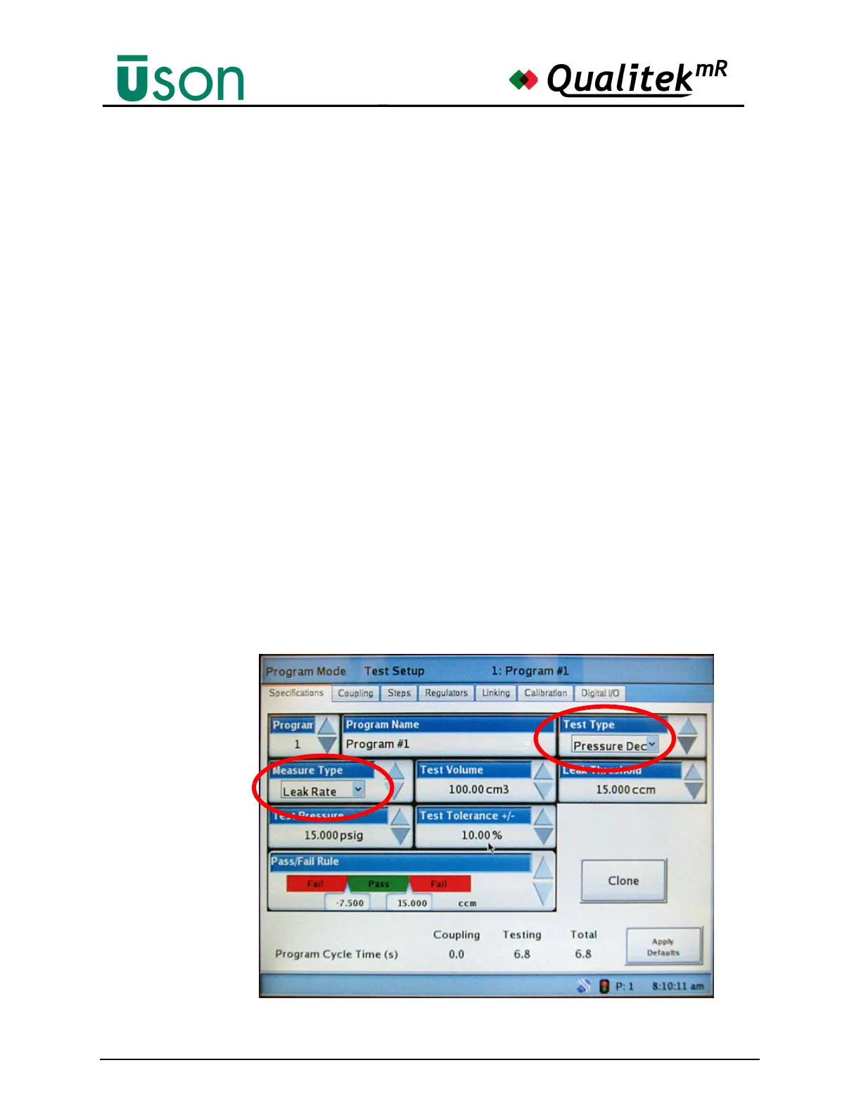 program is set to Leak Rate as shown and the Test Type is Pressure Decay. (The