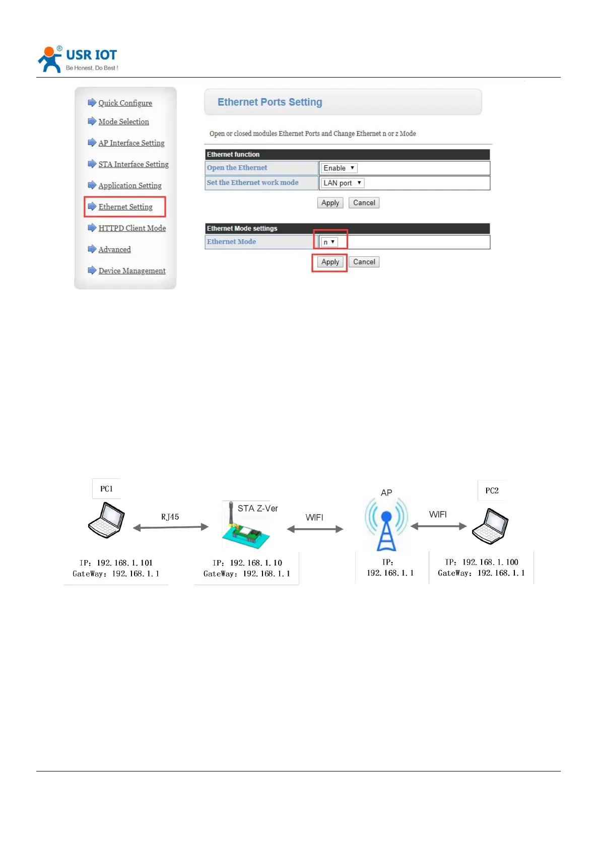 Ethernet interface will get an IP address from AP such as 192.168.1.101 in below diagram. In the whole network, DR404