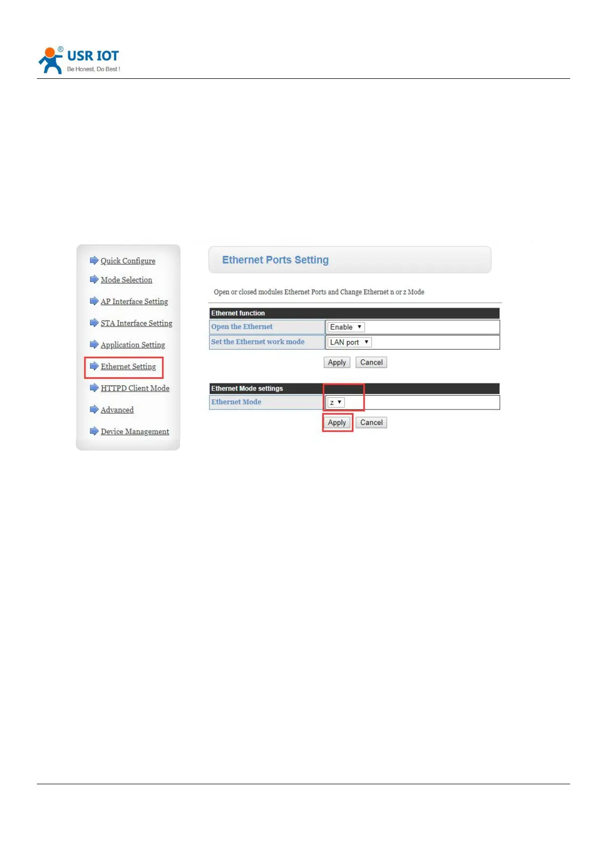 Web page setting: Log in to the built-in web page of DR404, enter the page of Ethernet setting, and set the Ethernet Mode