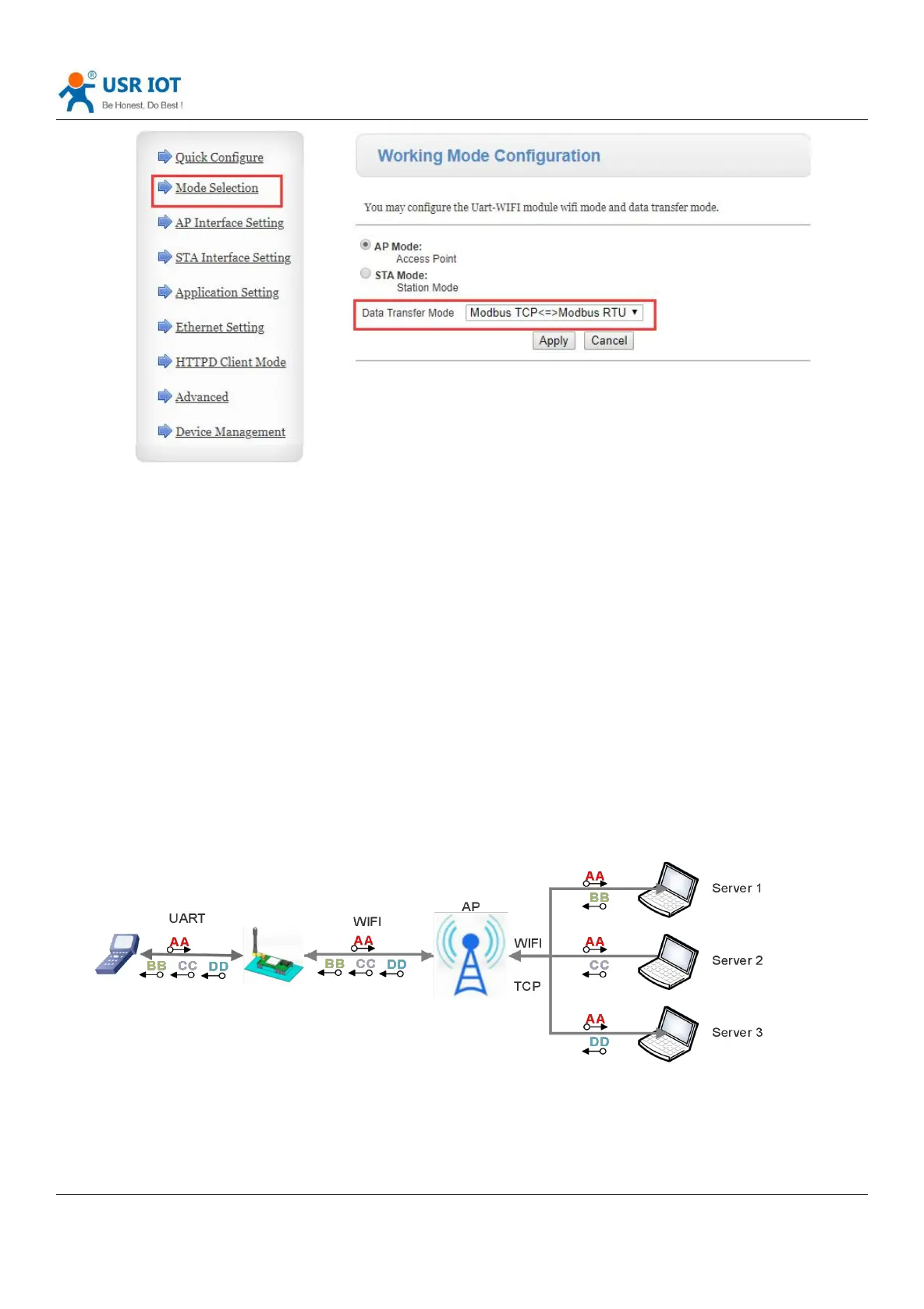 transmitted from TCP will be forwarded to the serial port one by one. The data coming from the serial port will be copied
