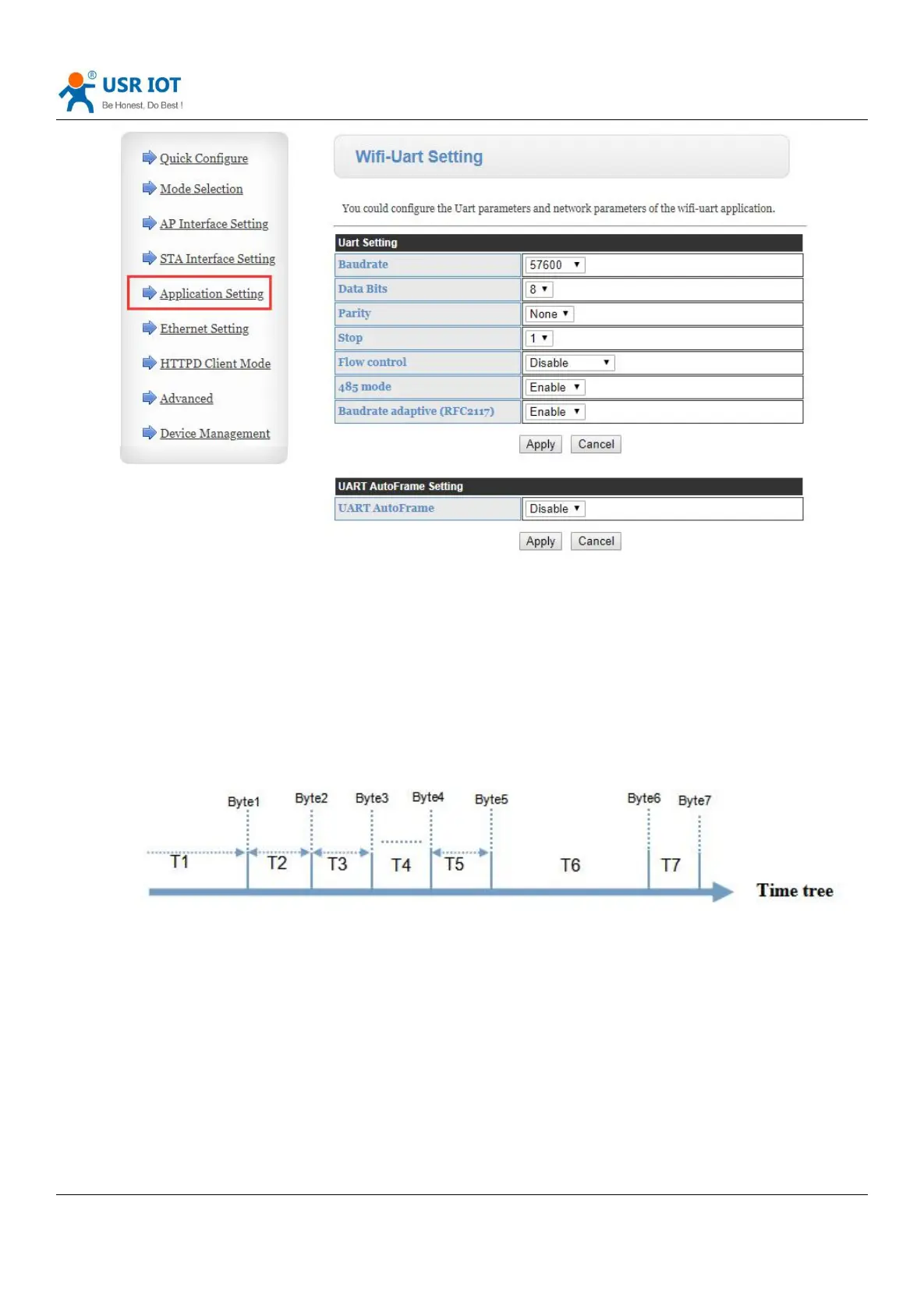 frame interval, unit is ms, when T1 >n, T2<n, T3<n, T4<n, T5<n and T6>n, then take byte1 -byte5 as a frame, as bellow: