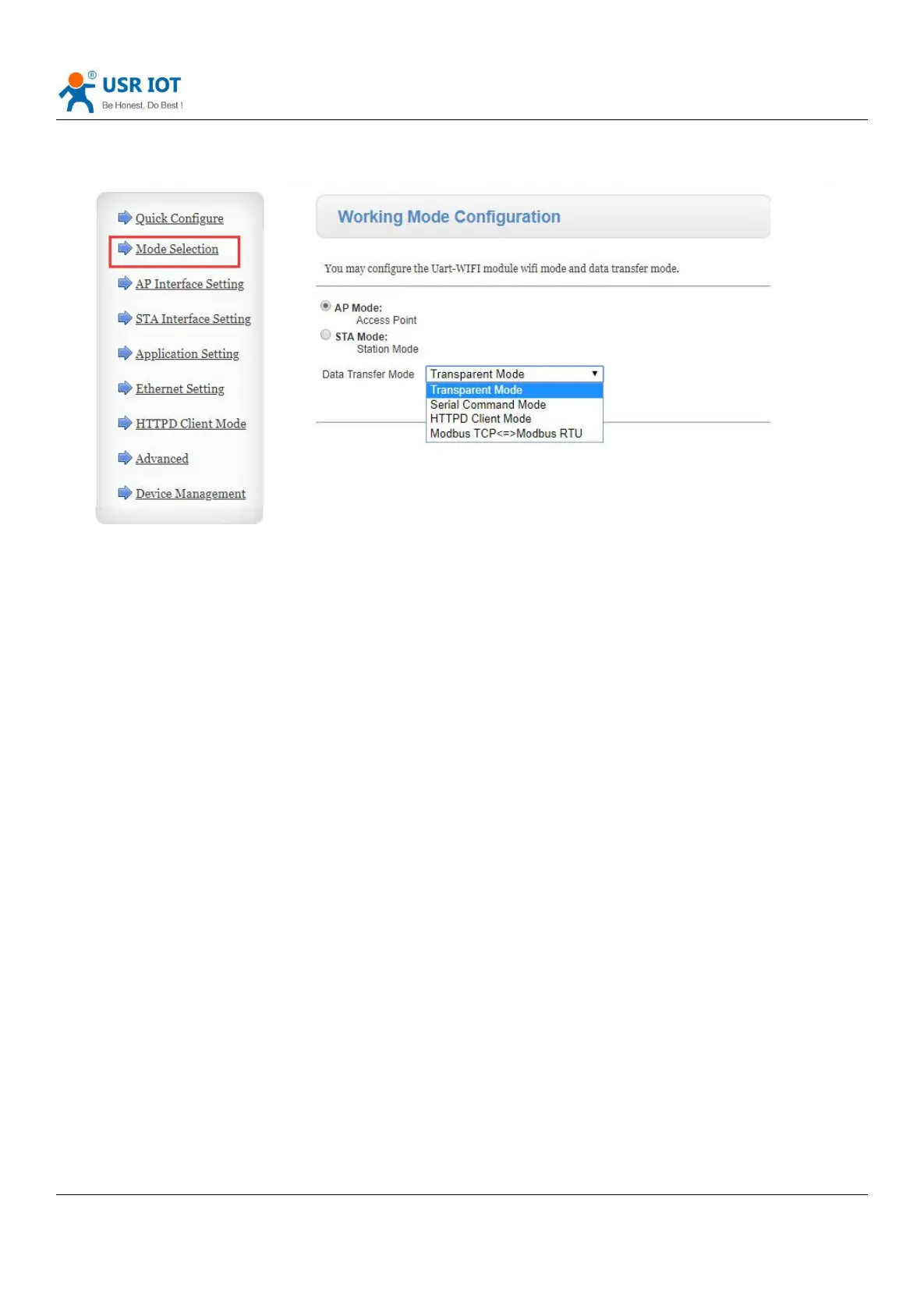 Data transfer mode including “transparent mode”, ”serial command mode”, ”HTTPD client mode”, ”modbus TCP and