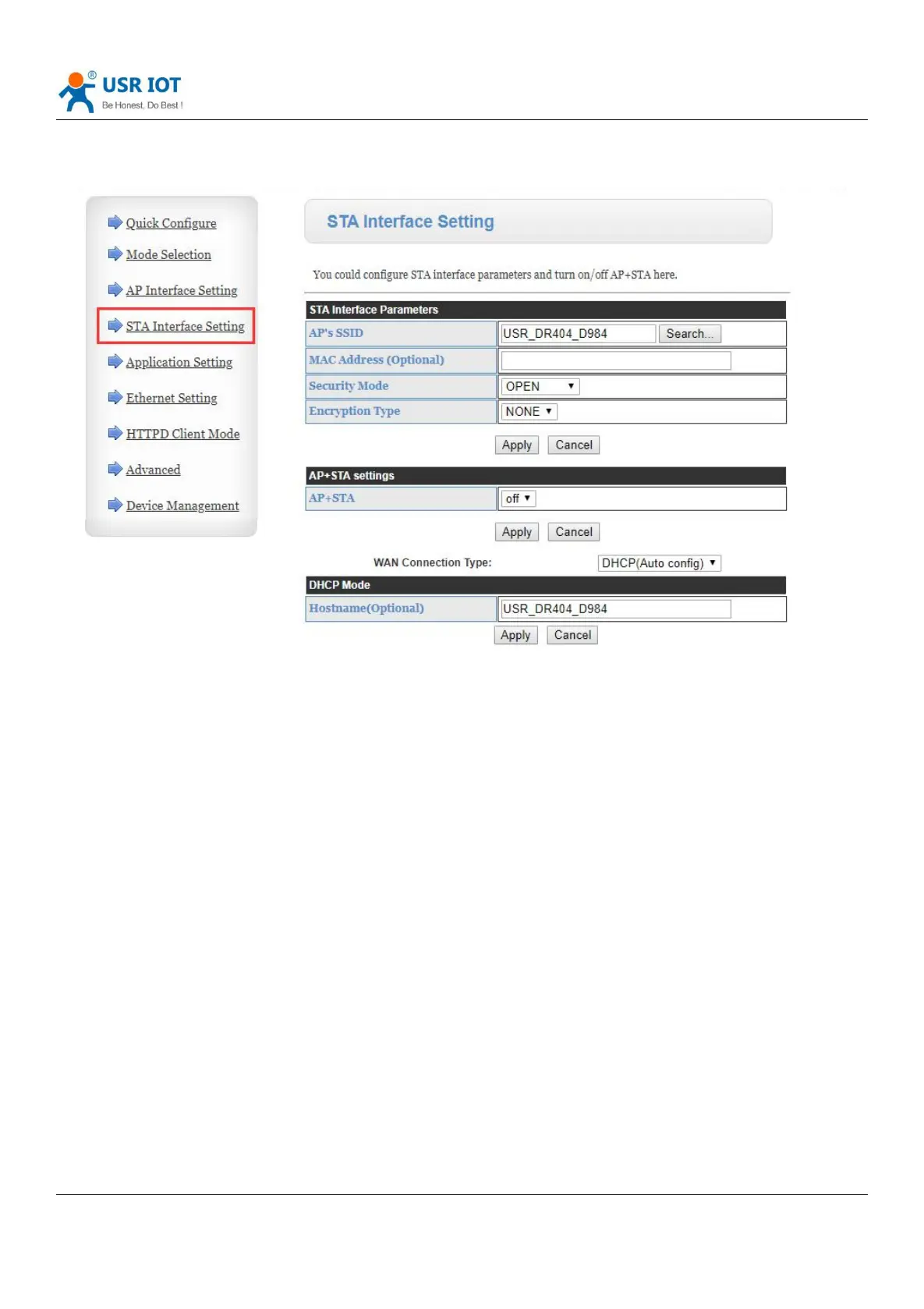 connect, security mode and others. Second one is AP+STA, click to choose enable or not. The latter one is WAN connection