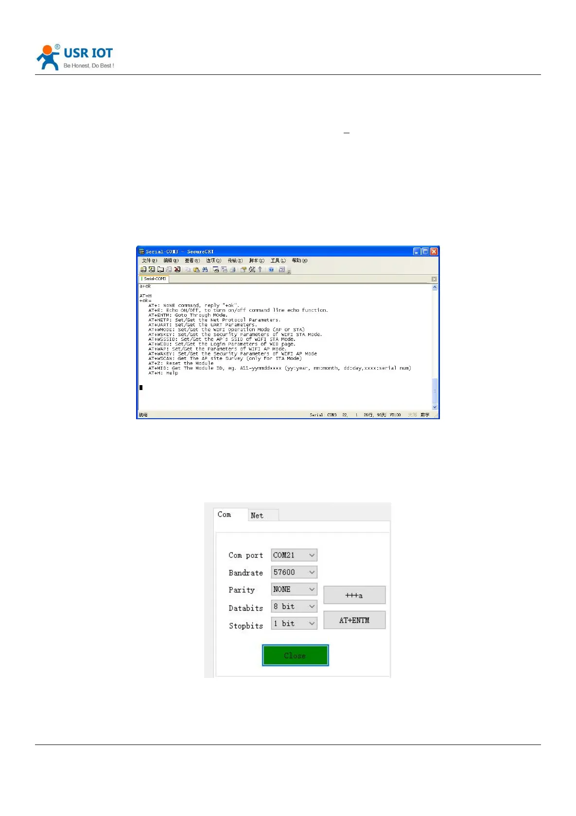 1. Serial device send “AT+ENTM”to module.