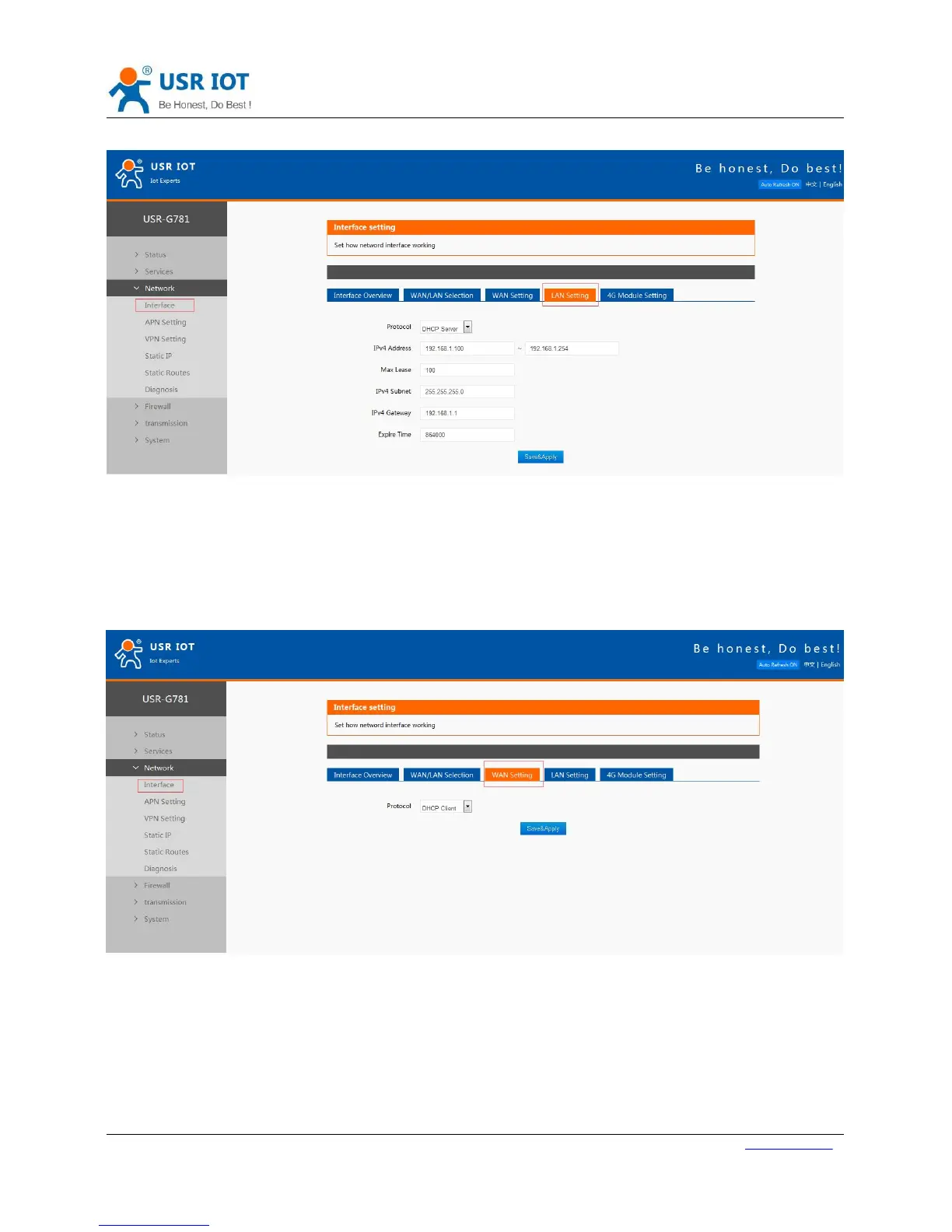 G781 has one WAN interface. Support DHCP Client and Static Address, default setting is DHCP Client.