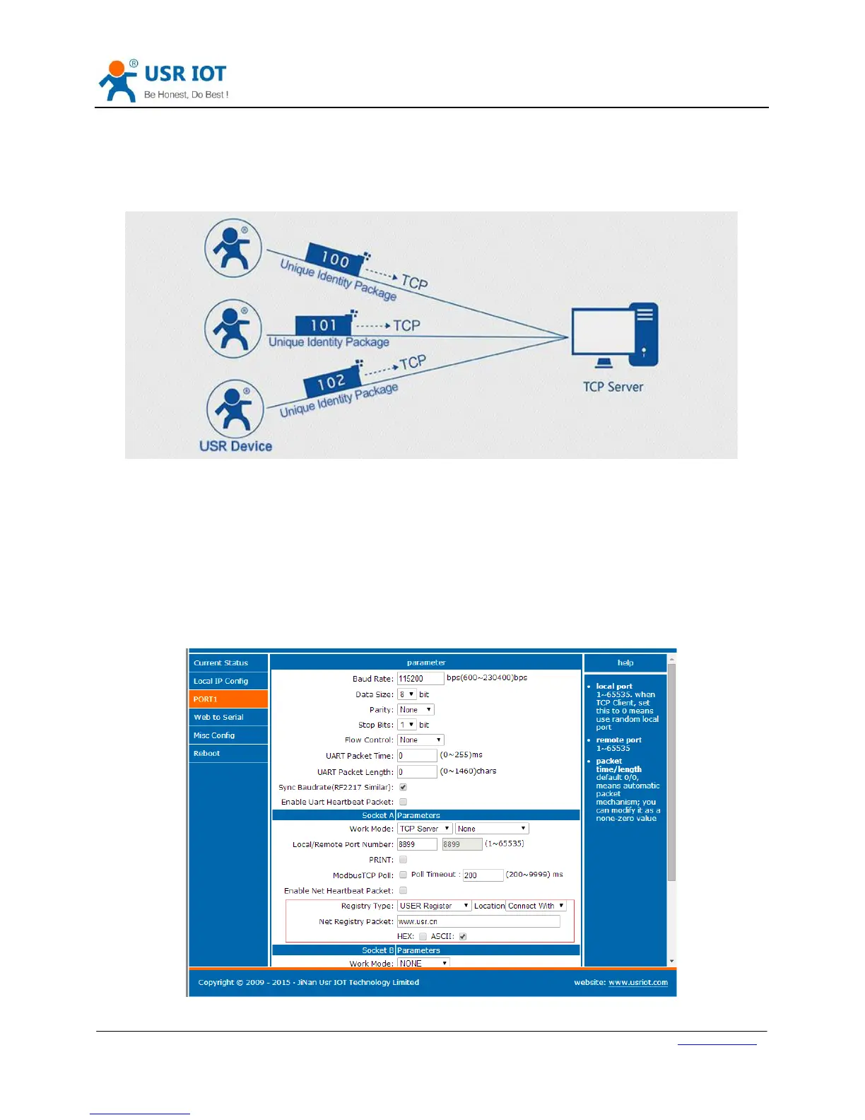 Identity packet is used for identify the device when module works as TCP client/UDP client. There are two