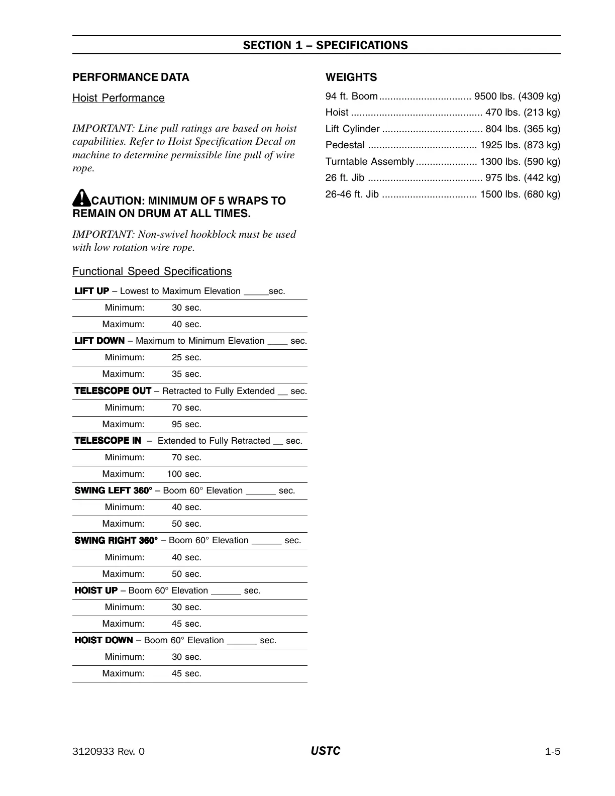 94 ft. Boom................................. 9500 lbs. (4309 kg)