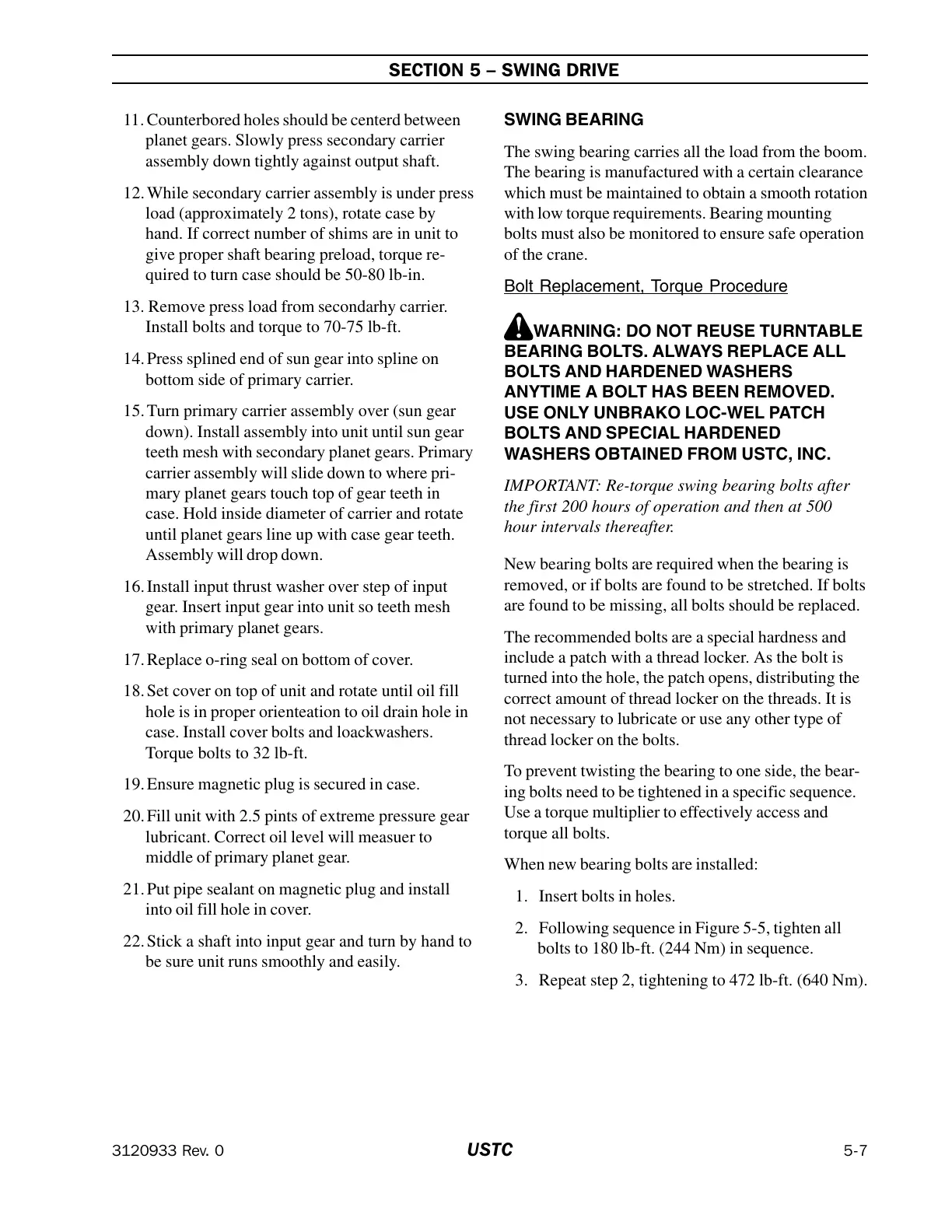 IMPORTANT: Re-torque swing bearing bolts after