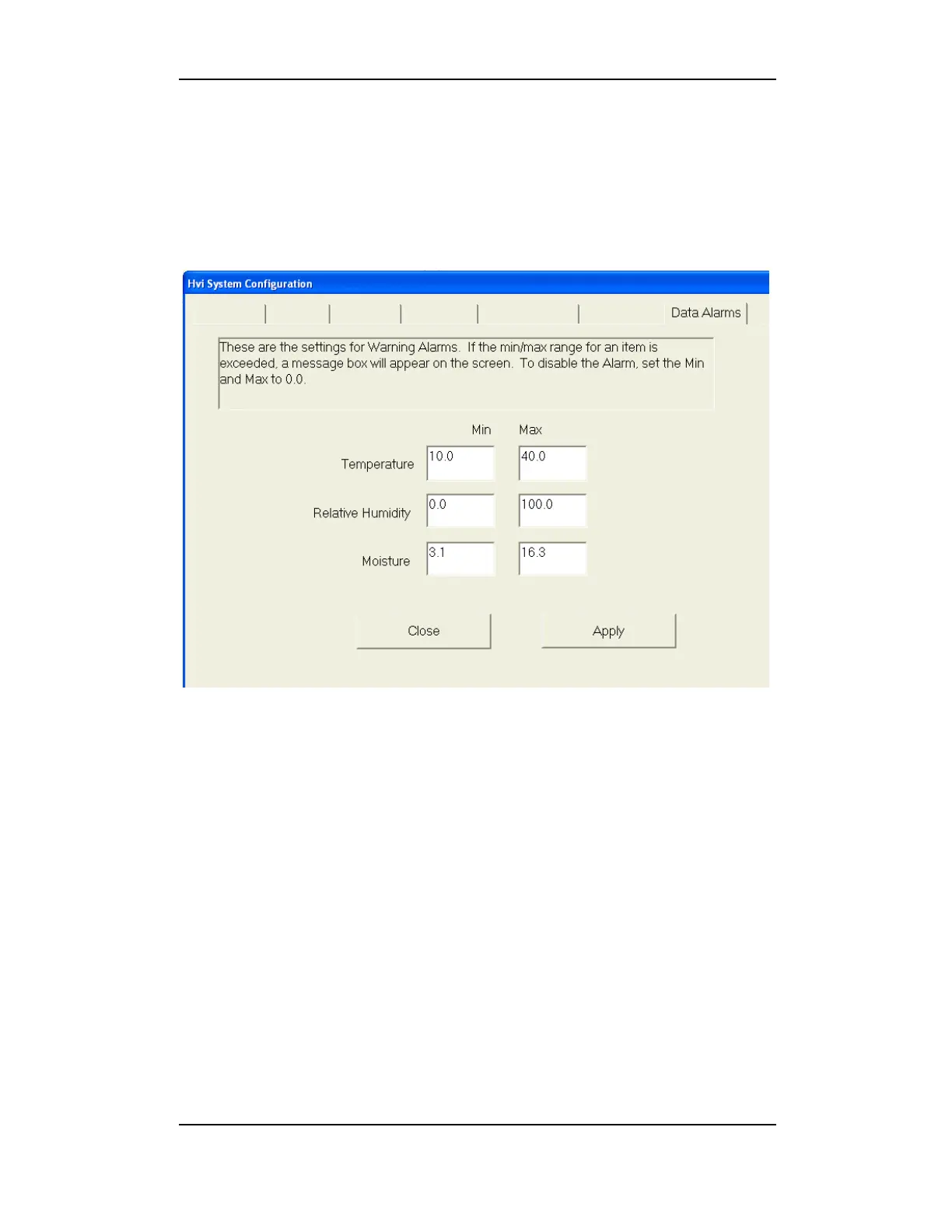 To disable alarms, set the minimum and the maximum range(s) to 0.