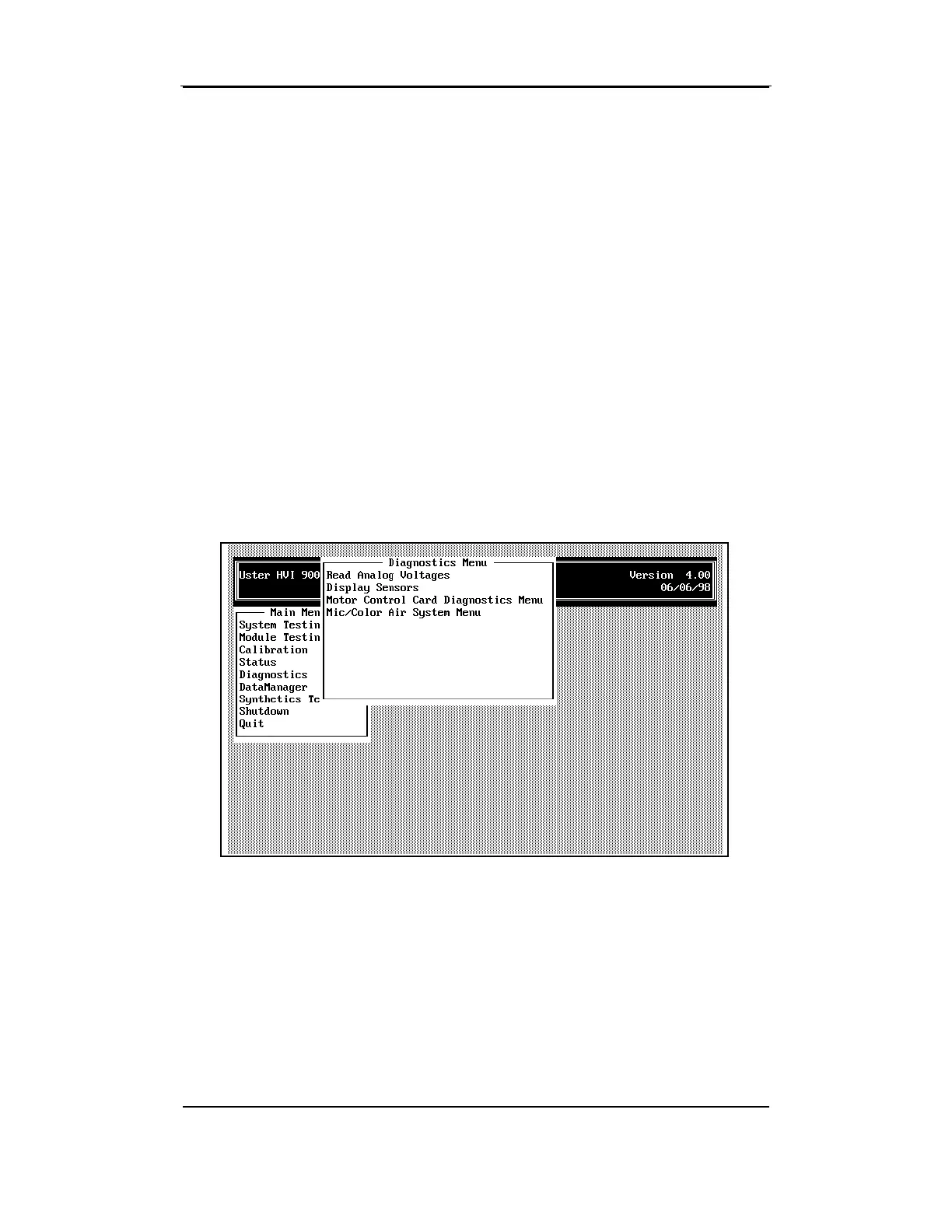 the DIAGNOSTICS MENU by Uster Technologies personnel. This chapter