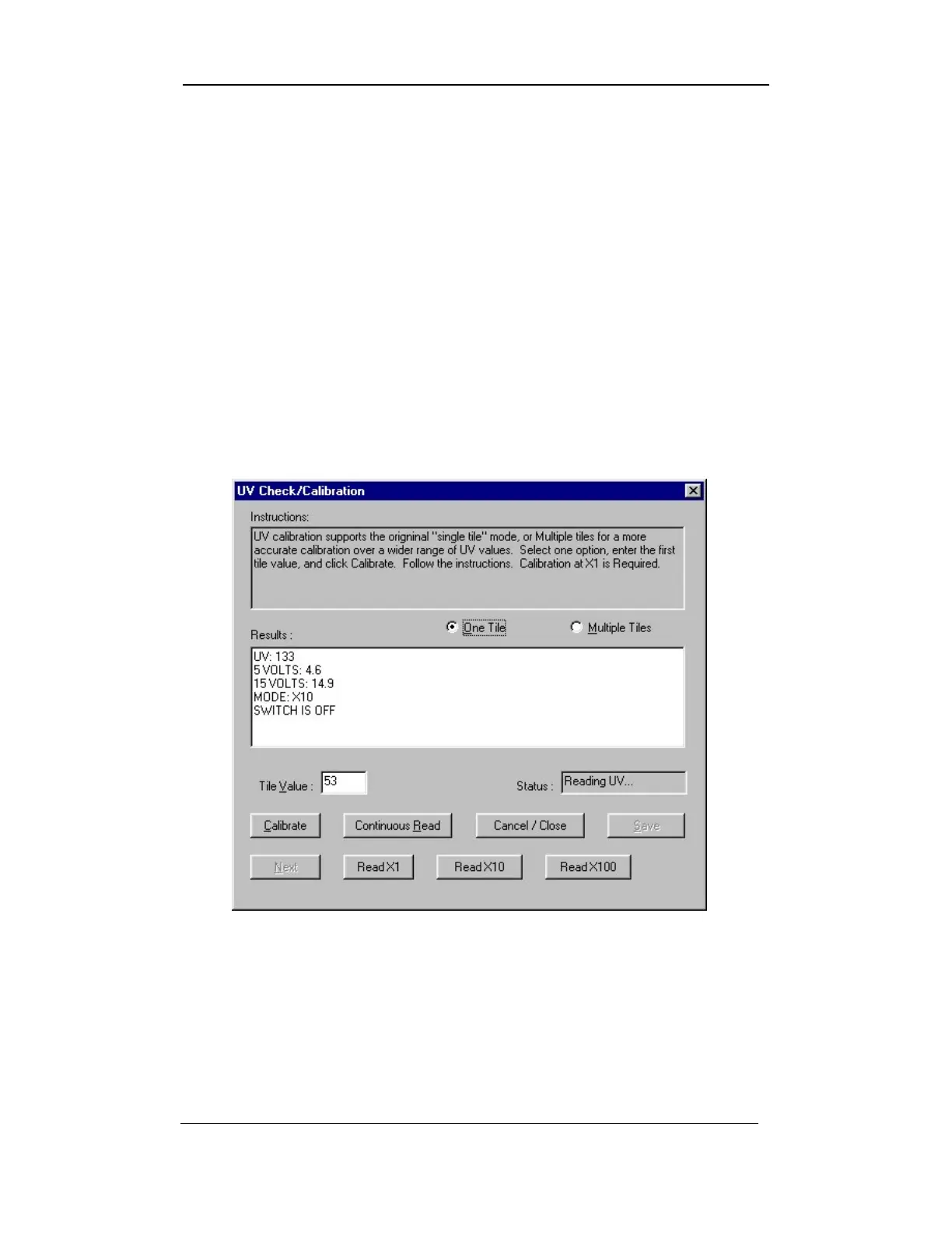 5. Click Calibrate. The UV Meter values will be displayed at a