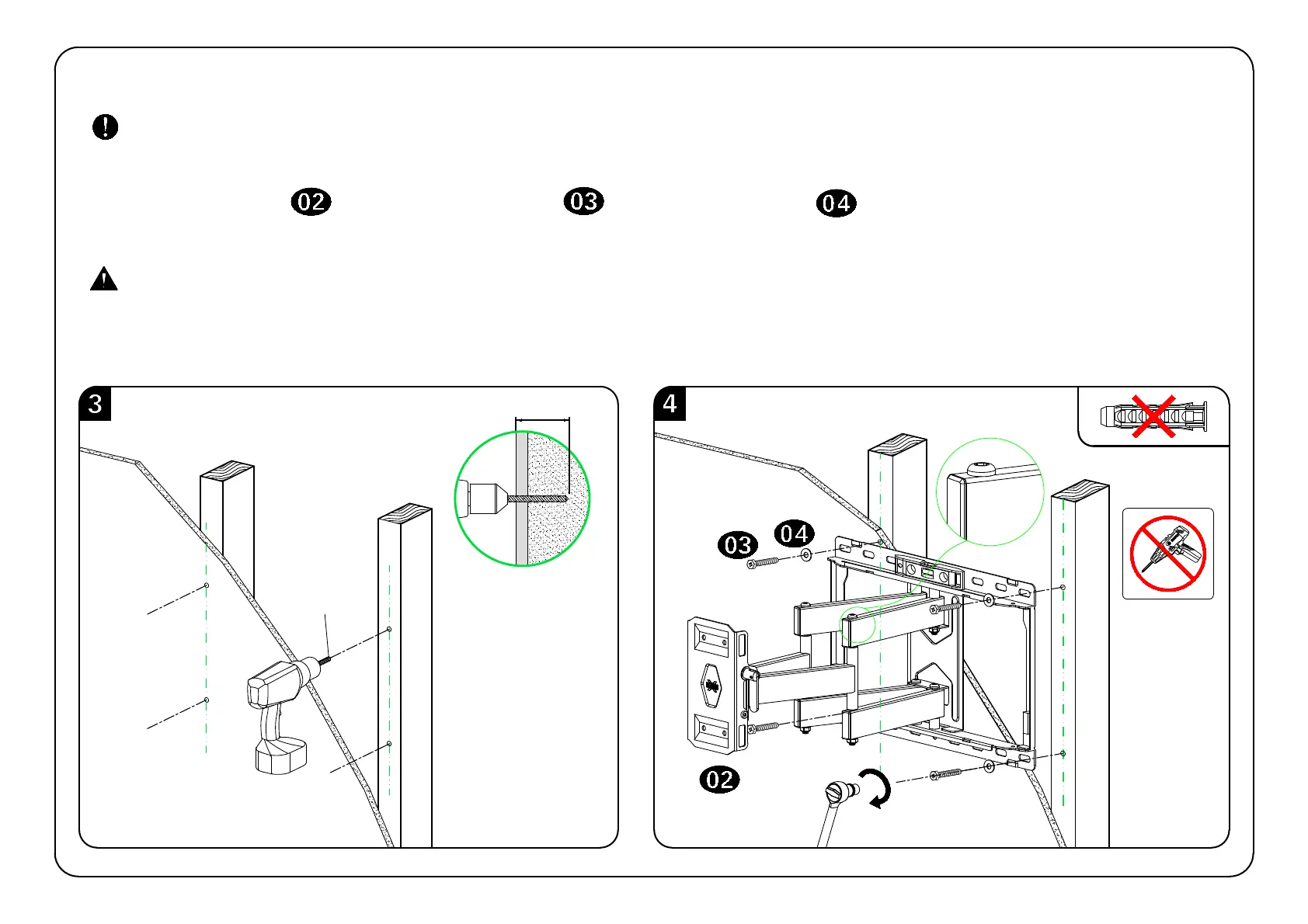4. Install wall plate using four lag bolts and four washers . Tighten the lag bolts only until