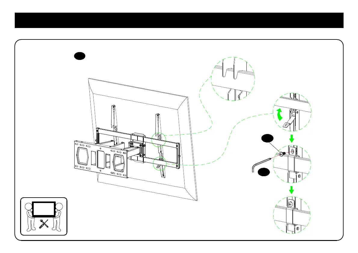 Hang TV/bracket assembly onto wall plate, wrap clips on bracket around extension arms and tighten