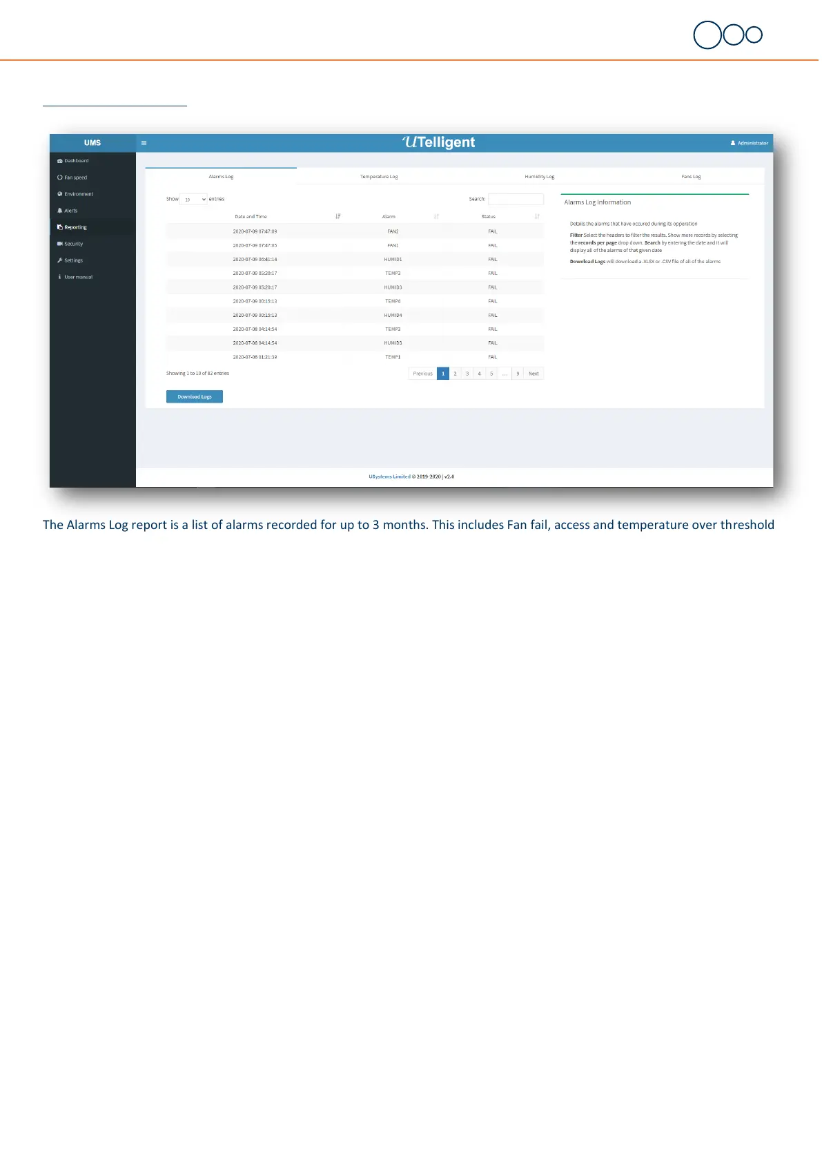 The Alarms Log report is a list of alarms recorded for up to 3 months. This includes Fan fail, access and temperature over threshold